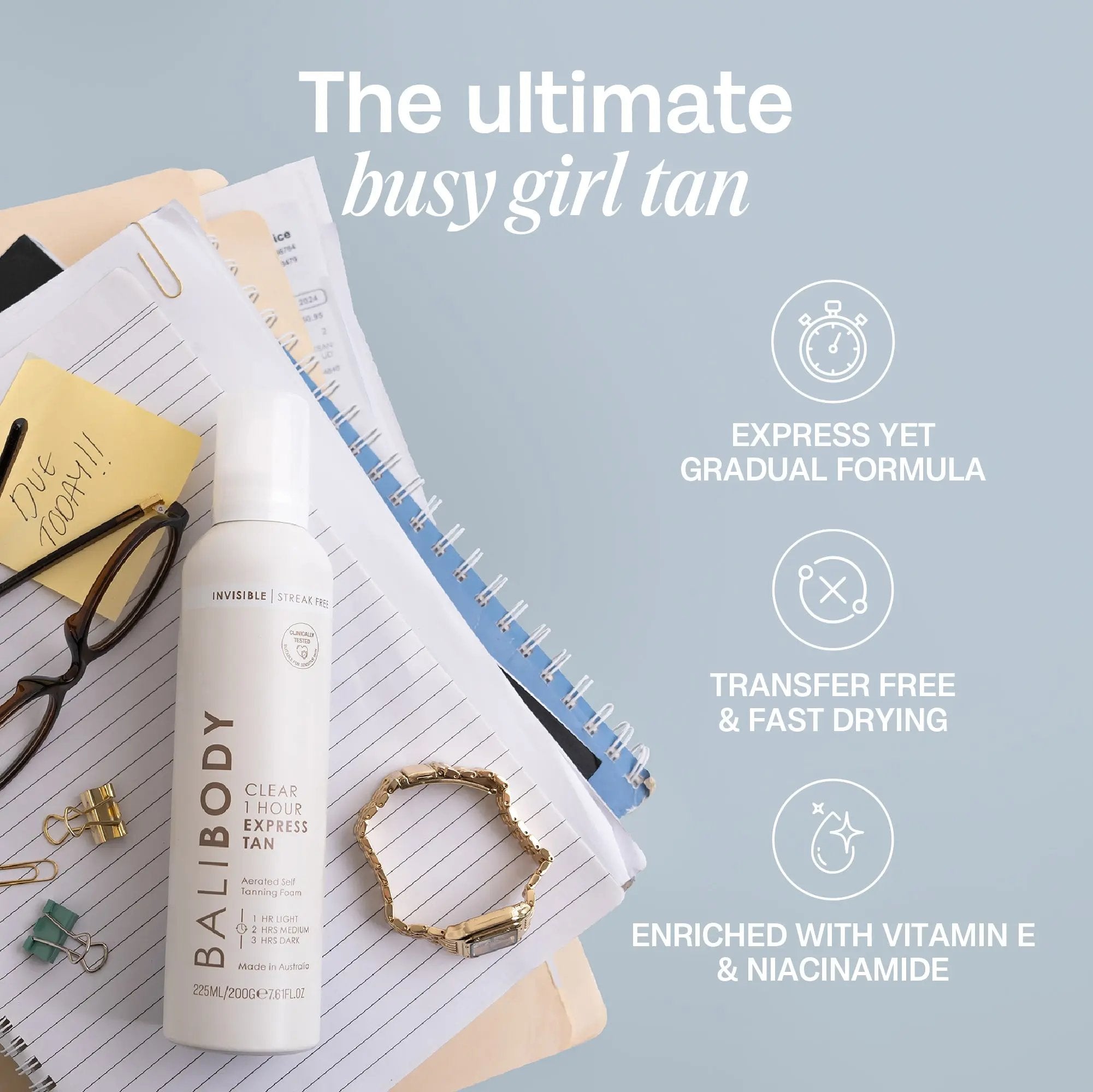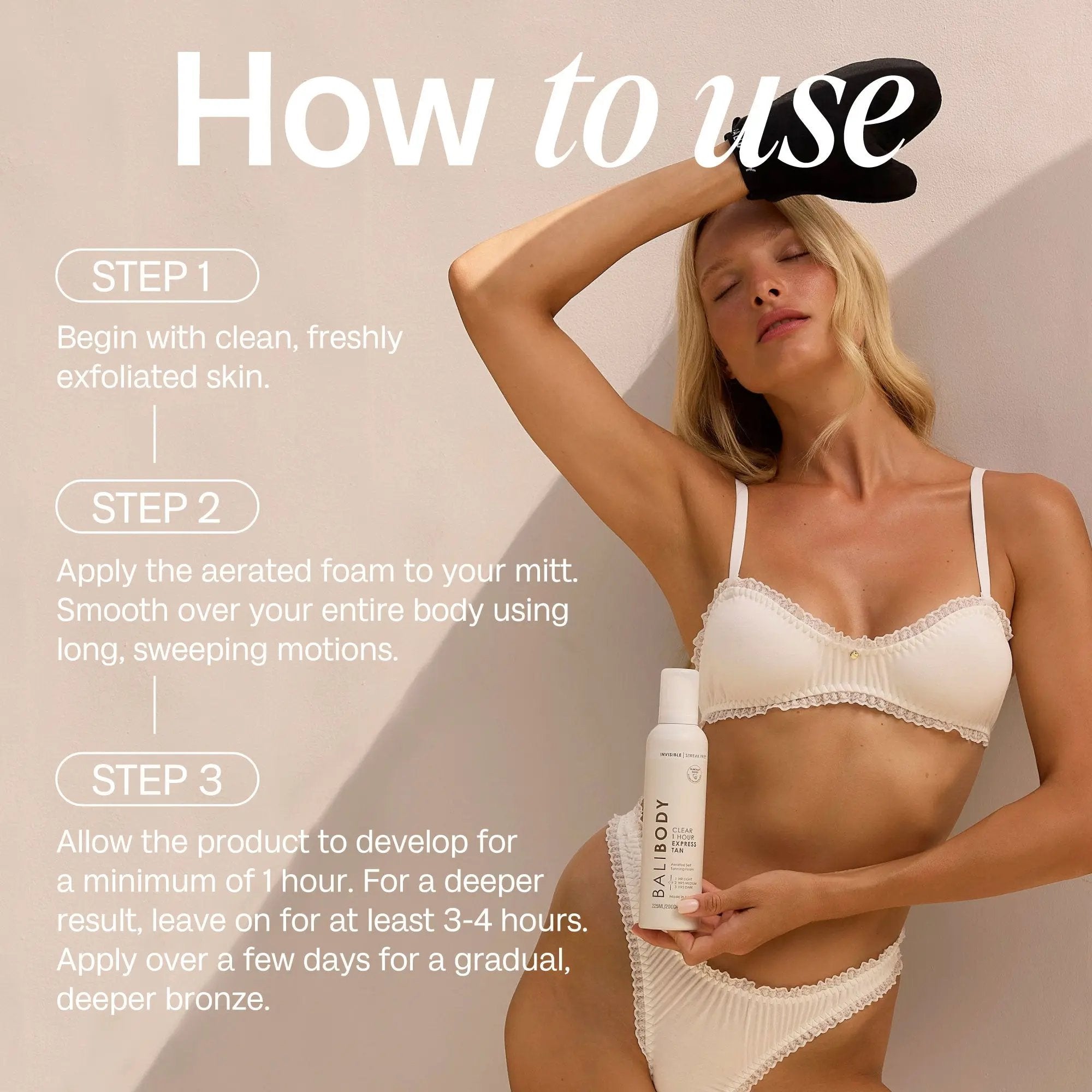 Le Bali Body 1 Hour Express Clear est ton nouveau must-have pour un bronzage impeccable sans prise de tête ! Cette mousse aérienne et ultra légère est complètement transparente et sèche rapidement, pas de taches, pas de traces, pas de transfert sur les vêtements. Que tu veuilles un glow naturel en une heure ou construire ta teinte idéale couche après couche, ce bronzage s’adapte à ton rythme.