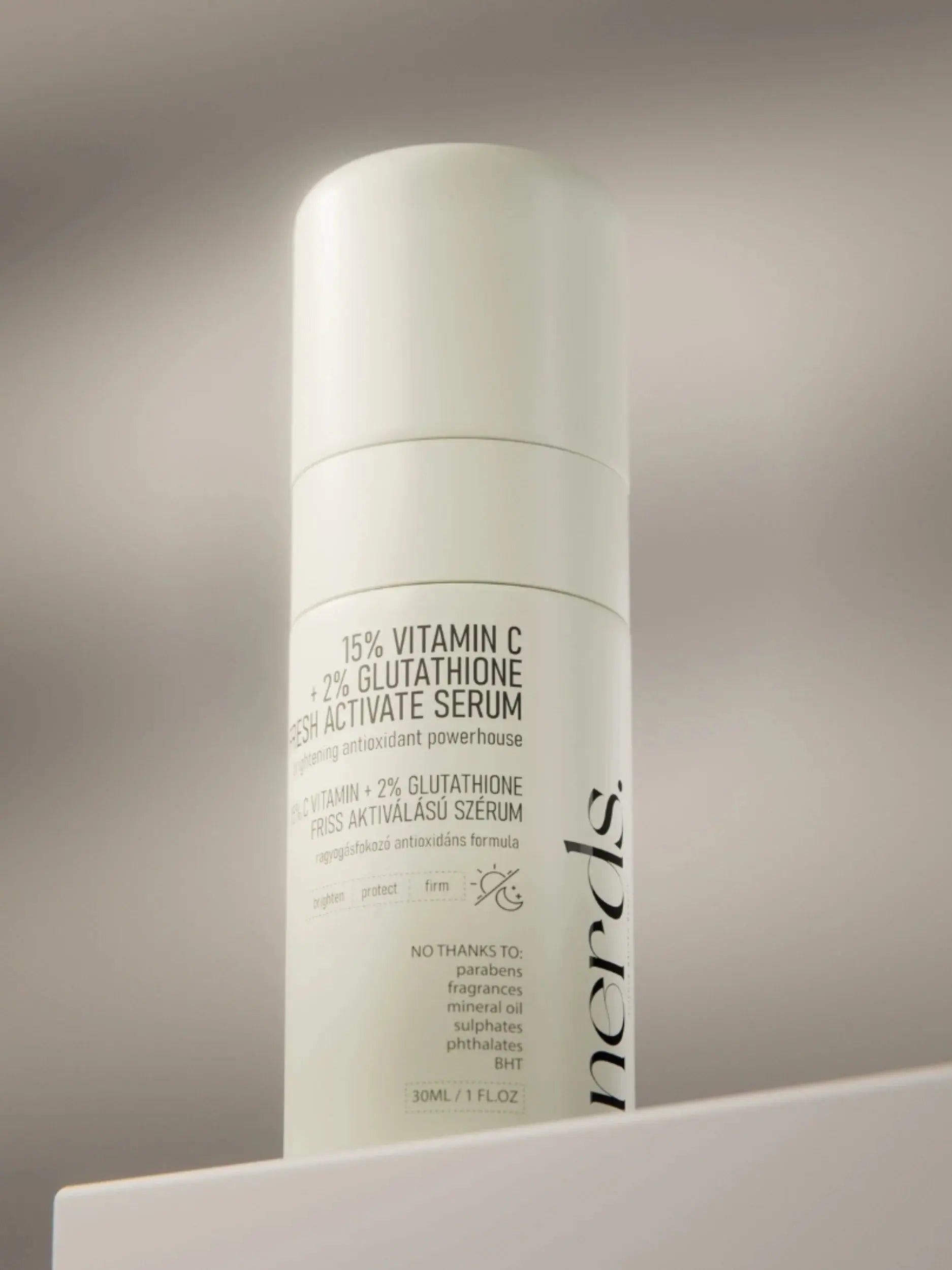 Le NERDS 15% Vitamin C + 2% Glutathione Fresh Active Serum est un next generation antioxidant boost pour votre peau. Avec 15% de L-Ascorbic Acid et 2% de Glutathione, ce sérum combine deux puissants antioxydants pour une peau visiblement plus lumineuse, plus uniforme et plus forte.