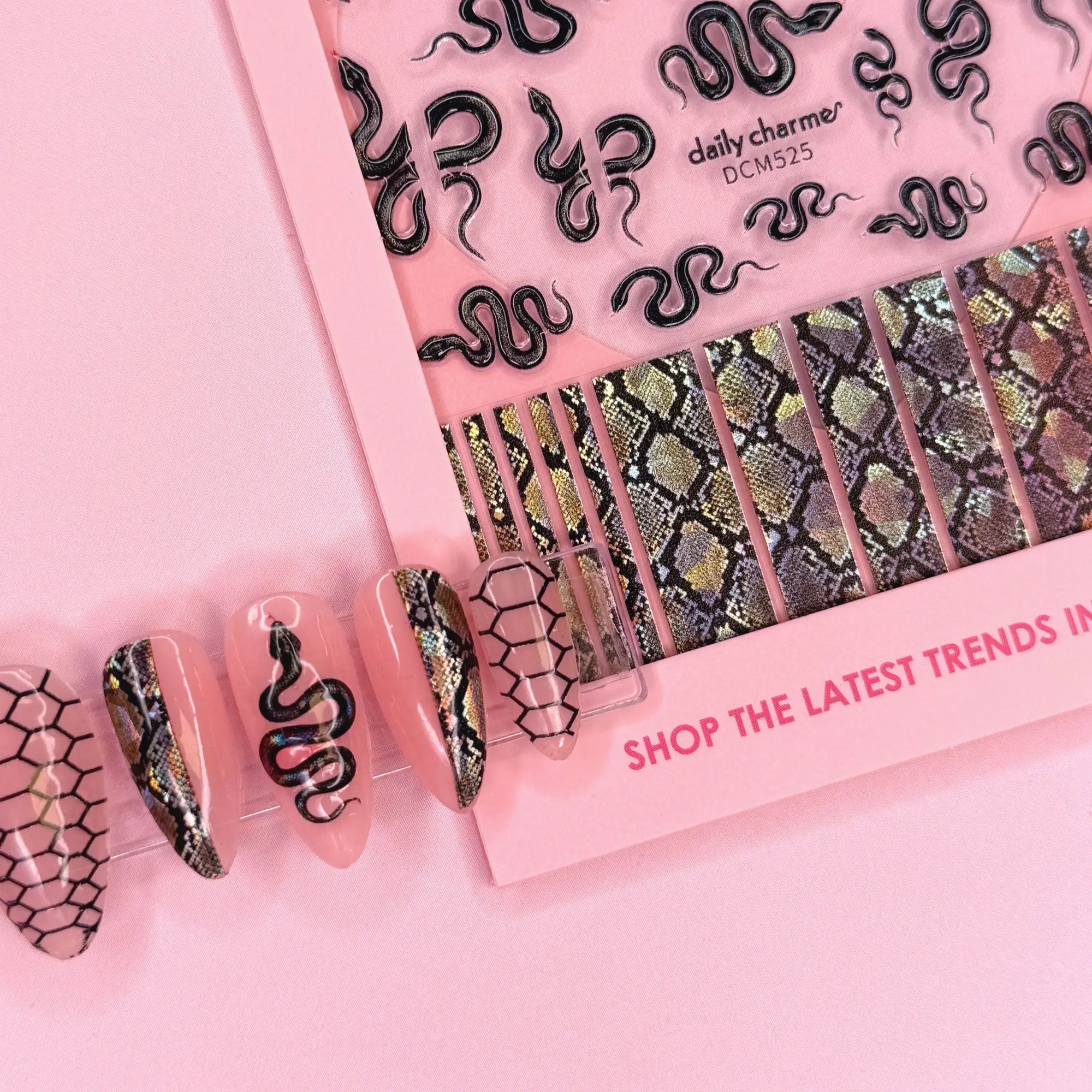 Le Daily Charme 3D Embossed Nail Art Sticker Holo Sunbeam Snake est ton indispensable pour une manucure pleine d’attitude. Cette planche audacieuse est remplie de serpents holographiques noirs brillants, d’imprimés serpent edgy et de bandes effet peau de serpent qui donnent à tes ongles une touche de haute couture hypnotisante.