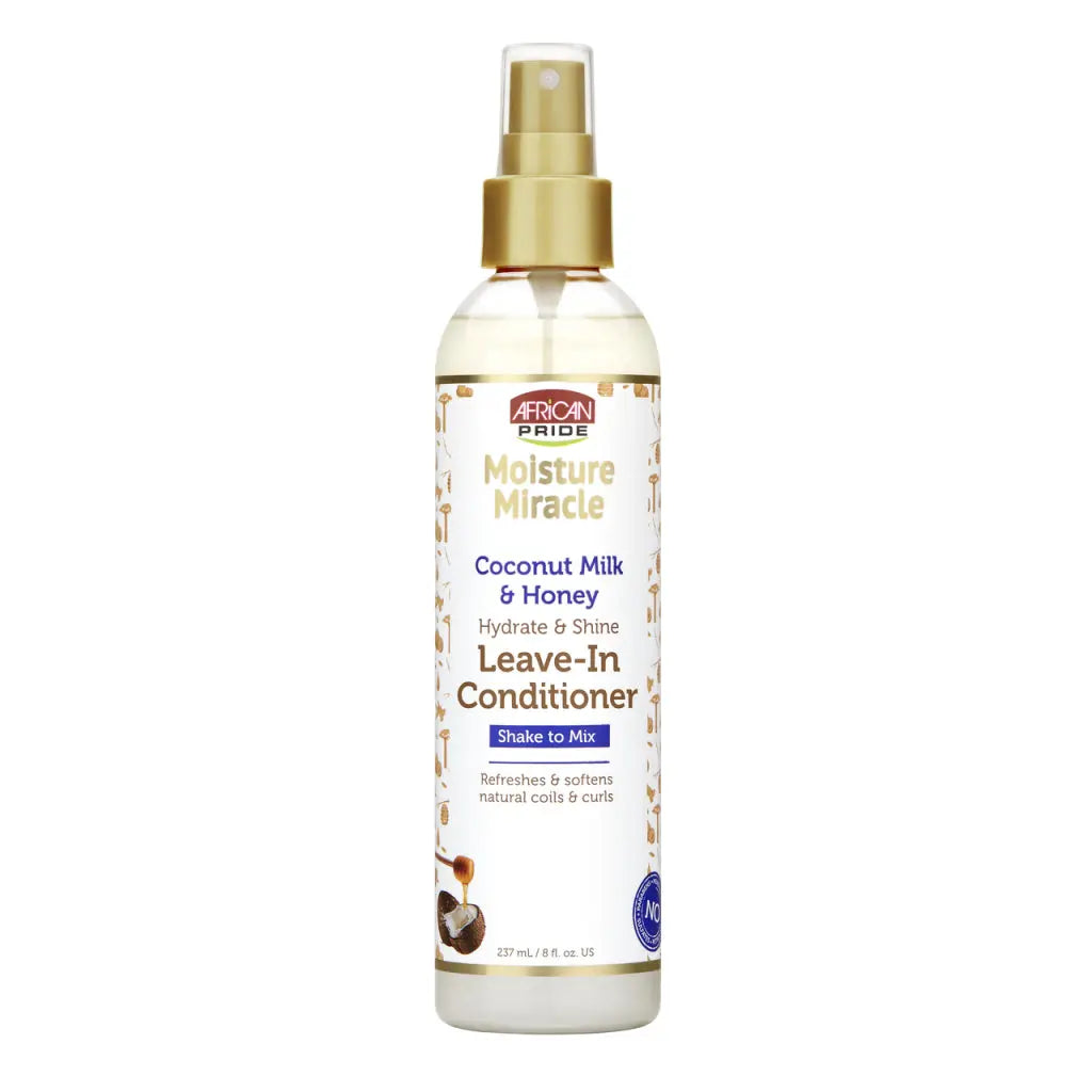 Le African Pride Moisture Miracle Leave-In Conditioner Spray est ta solution rapide pour des boucles assoiffées et fatiguées qui ont besoin d’un coup de boost. Ce spray pratique est idéal pour une utilisation quotidienne et parfait lorsque tes cheveux ont besoin d’un supplément d’hydratation et d’amour.