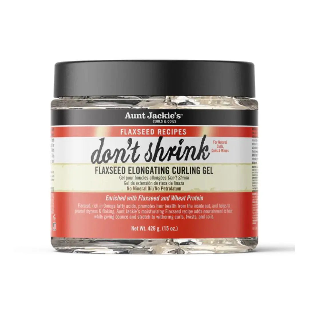 Le Aunt Jackie's Flaxseed Don't Shrink Curling Gel est le secret de belles boucles ! Ce gel innovant combine les bienfaits des graines de lin, du beurre de karité et de l'huile d'olive extra vierge pour nourrir, allonger et définir vos boucles sans les rétrécir.