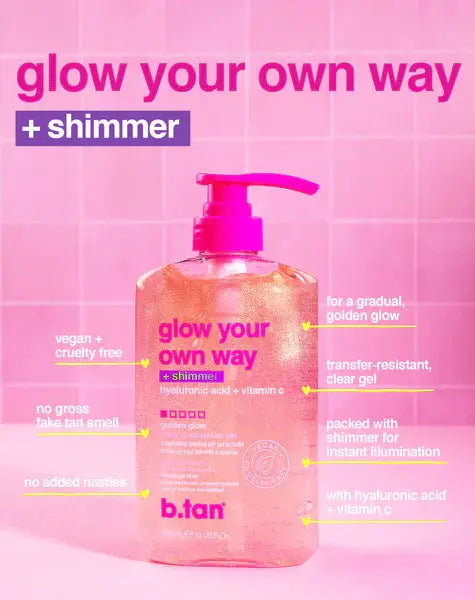 Le B.tan Glow Your Own Way Shimmer Gradual Self Tan Gel est l'autobronzant parfait pour un éclat doré avec une touche scintillante. Ce gel clair et anti-transfert développe progressivement un bronzage hâlé naturel, tandis que ses particules dorées illuminent immédiatement votre peau. Que vous souhaitiez créer un nouveau bronzage ou raviver votre couleur existante, cette formule vous garantit un glow à faire pâlir d’envie !