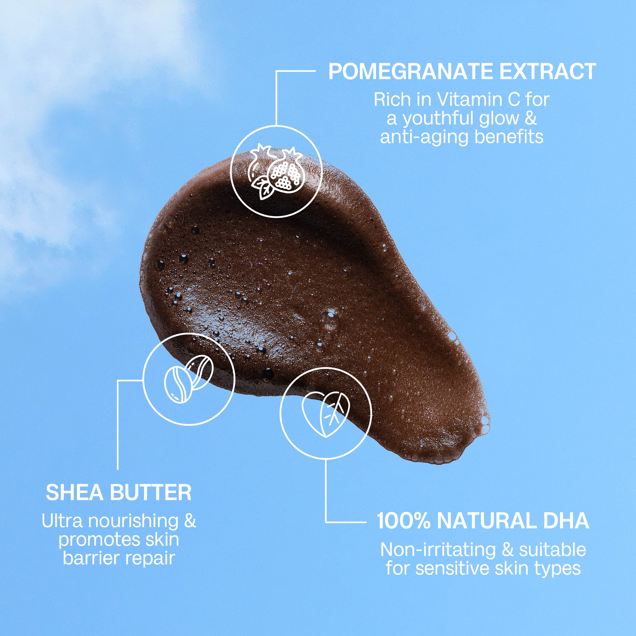 La formule contient 100 % de DHA d'origine naturelle et est enrichie en camomille et grenade pour apaiser, réparer et hydrater la peau pendant le processus de bronzage. Grâce à la technologie intelligente de guide couleur, le bronzage s’adapte à ta carnation pour un résultat uniforme et sans traces. Testée dermatologiquement et adaptée aux peaux sensibles. Glow assuré ? Check !
