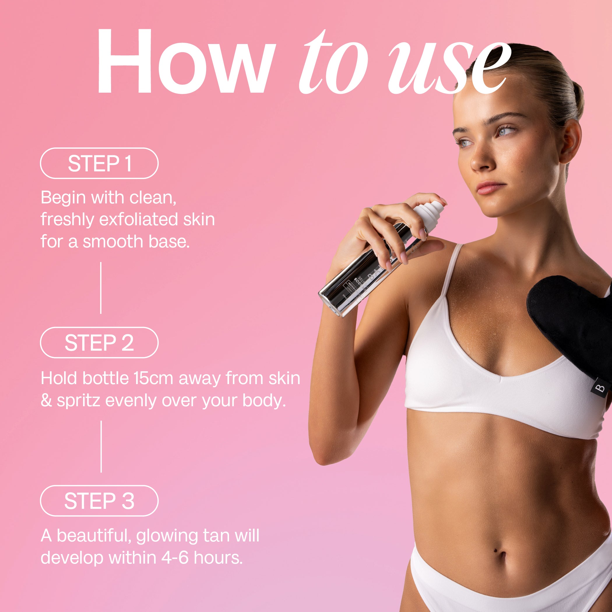 La Bali Body Self Tan Body Mist permet d'obtenir un teint hâlé sans avoir à s'exposer longtemps au soleil ! Cette formule apaisante utilise une technologie innovante de microbrume et ne contient aucun colorant.