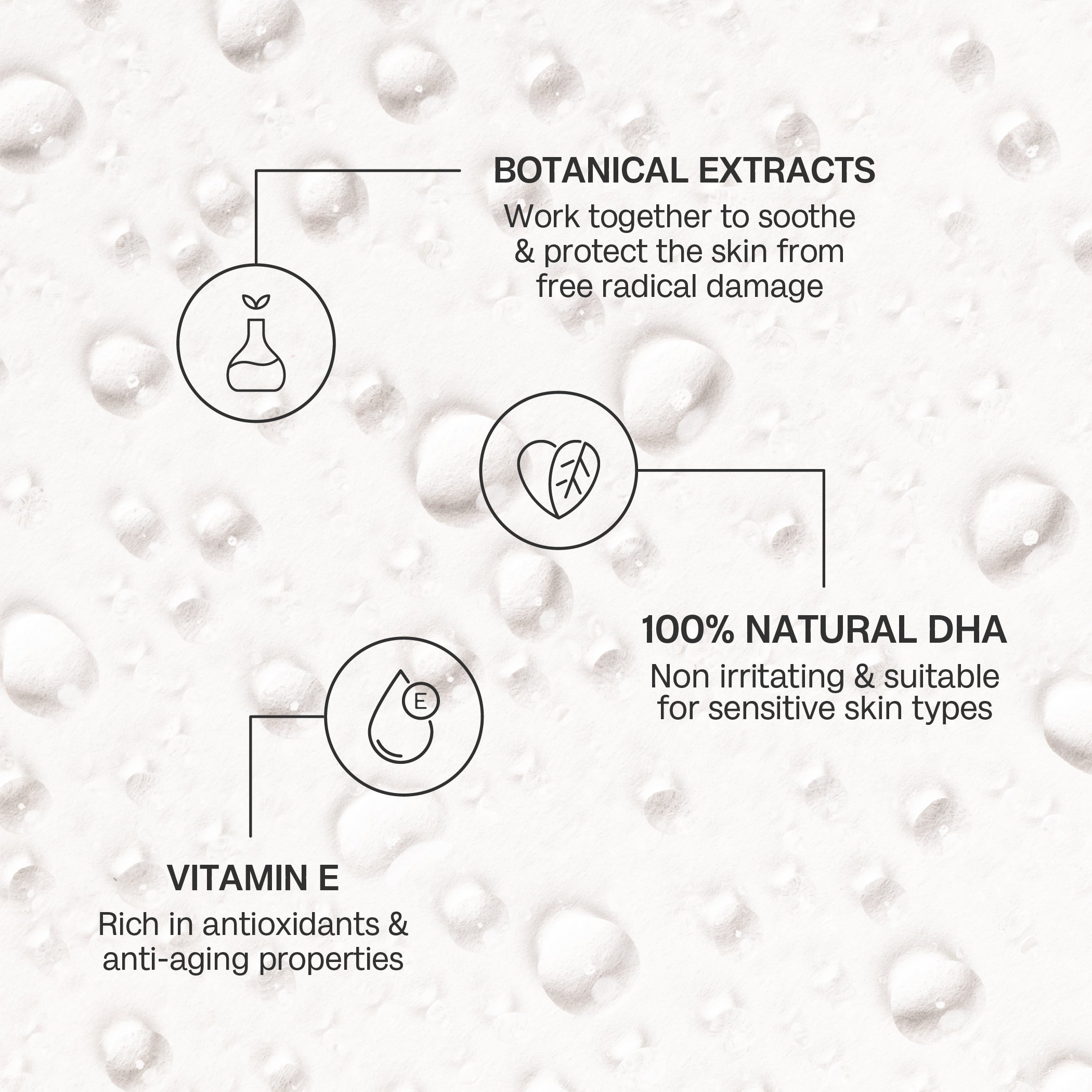 Water (Aqua), Dihydroxyacetone, Alcohol, Ethoxydiglycol, Erythrulose, Dimethyl Isosorbide, Sodium Metabisulfite, Citrus Sinensis (Orange) Fruit Extract, Ficus Carica (Fig) Fruit Extract, Mangifera Indica (Mango) Fruit Extract, Musa Paradisiaca (Banana) Fruit Extract , Nelumbo Nucifera Flower Extract, Hexyl Cinnamal, Glycine Soja (Soybean) Oil, Glycerin, Tocopherol, Fragrance (Parfum), Sodium Citrate, Citric Acid, Tetrasodium Glutamate Diacetate, Phenoxyethanol, Benzyl Alcohol, Ethylhexylglycerin, Sodium Benzoate, Limonene, Linalool, Citronellol , Geraniol, Alpha-Isomethyl Ionone