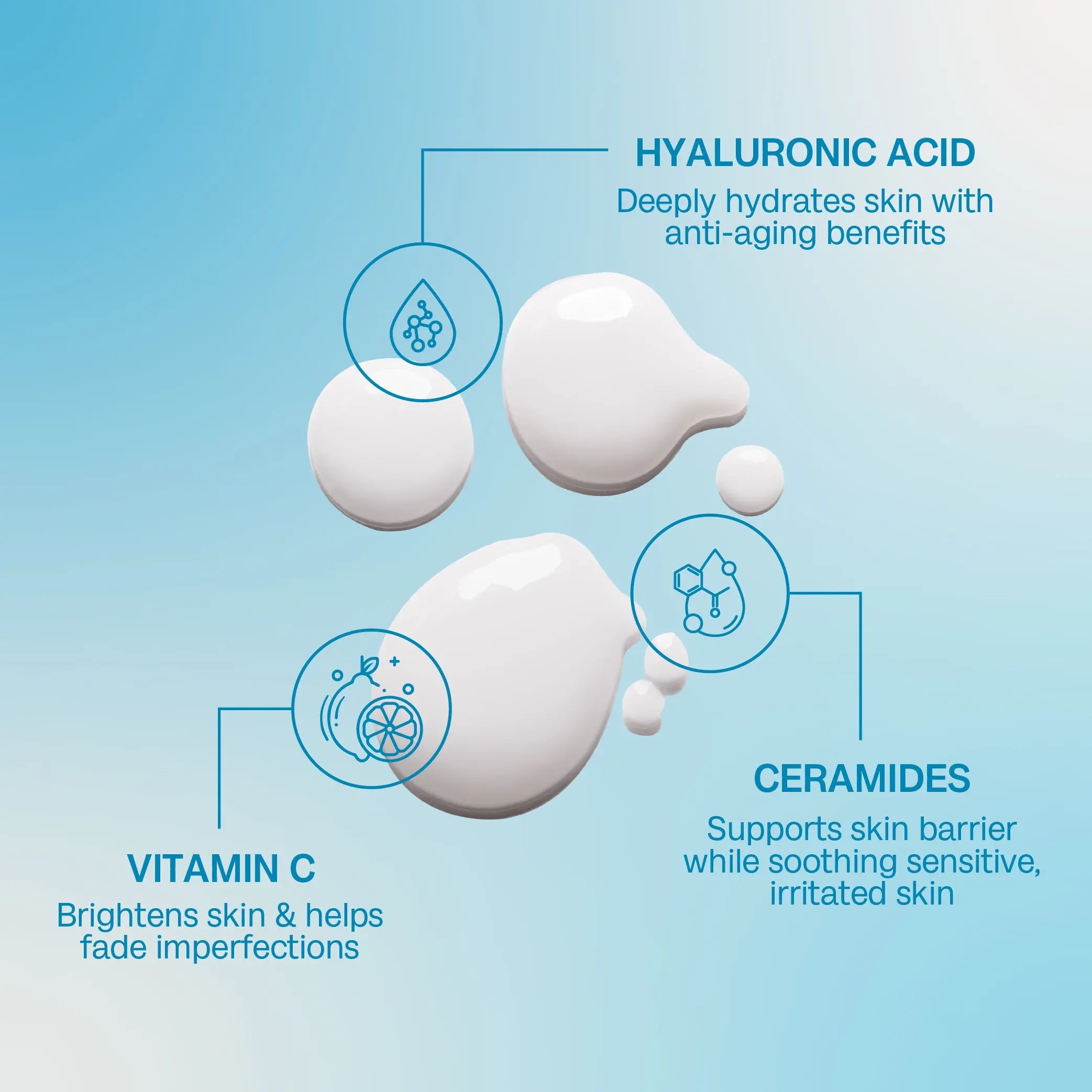 Enrichi de 4 niveaux gradués d'acide hyaluronique, de céramides et de vitamine C pour nourrir et hydrater en profondeur tout en développant un teint magnifique et uniforme.