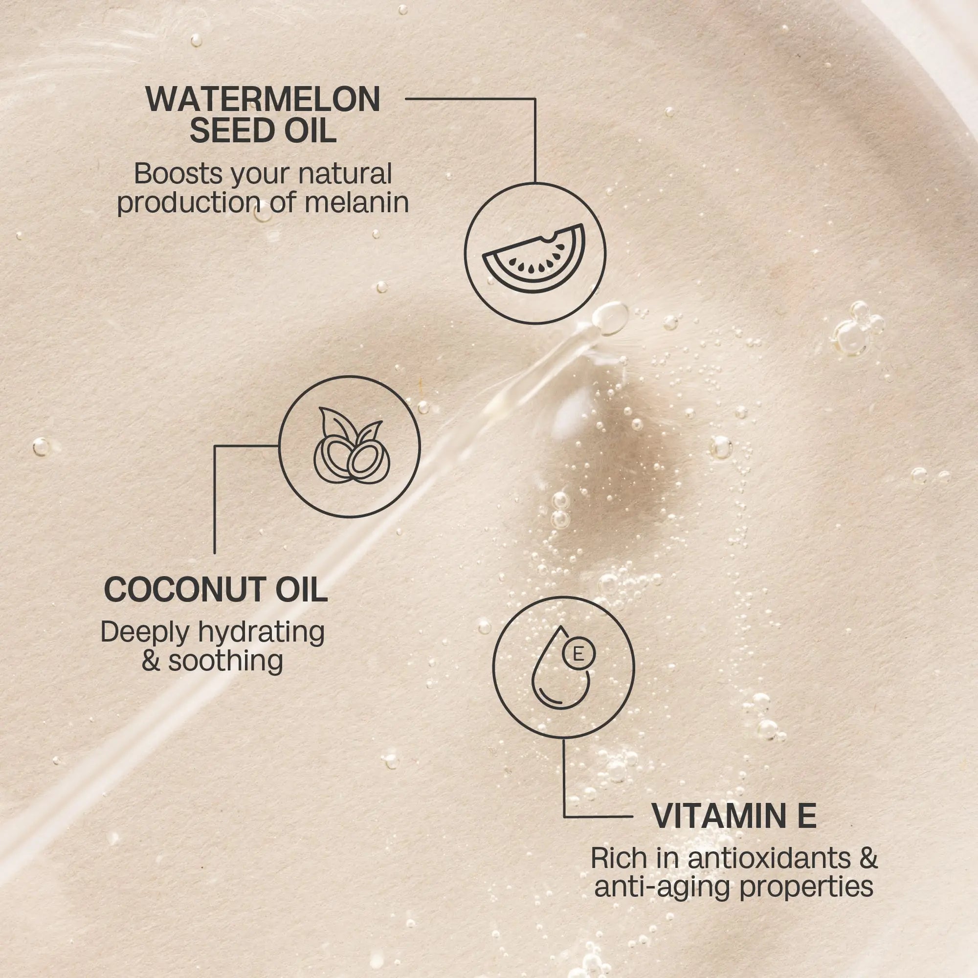 Cette huile de bronzage est végétalienne et contient de la pastèque, de l'huile d'amande et de la vitamine E. Ces ingrédients sont efficaces contre le vieillissement cutané et stimulent la production naturelle de mélanine. De plus, la peau est intensément hydratée et la peau paraîtra plus ferme et se sentira plus douce et plus lisse.