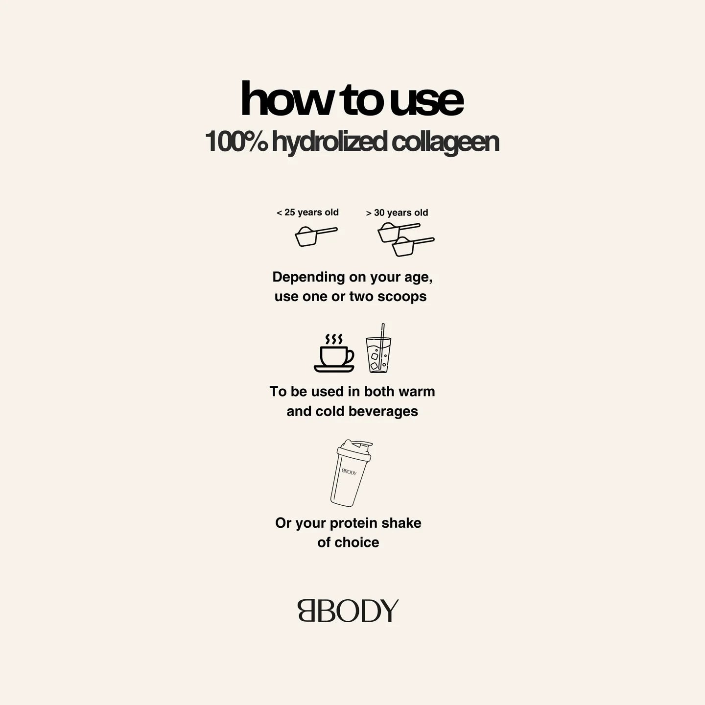 Voté numéro 1 par les plus grands magazines de beauté flamands et français, il n'est pas étonnant que ce collagène soit leader dans le monde des compléments de beauté. En effet, chez Bbody, ils ont choisi du collagène marin 100 % hydrolysé, fabriqué à partir de peaux de morue sauvage certifiées MSC. De plus, ce collagène est exempt d'édulcorants transformés tels que le fructose et la stévia, car ceux-ci décomposent le collagène.