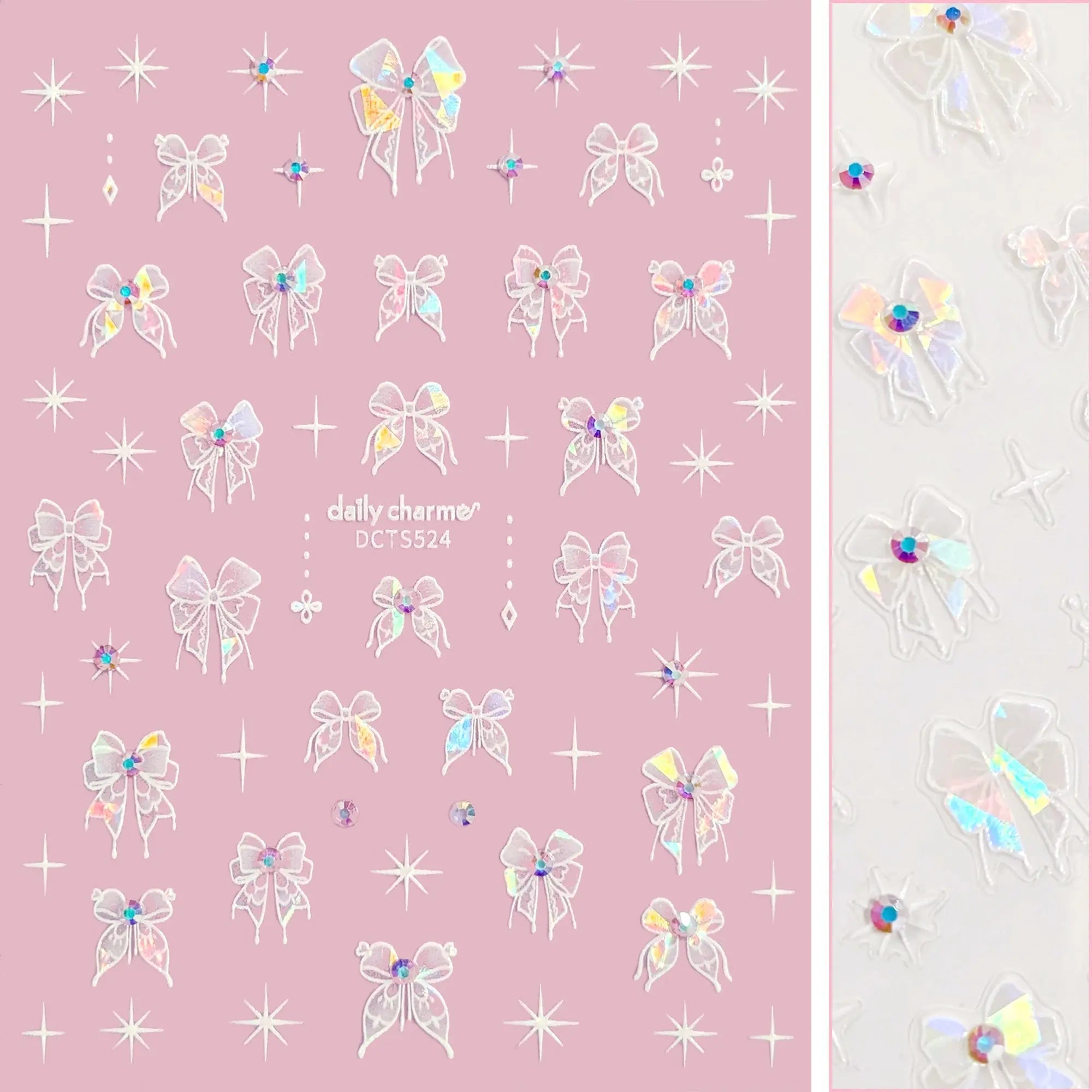 Le Daily Charme Bejeweled Nail Art Sticker Dreamy Ribbon Bows est parfait pour toutes celles qui aiment les ambiances douces et romantiques avec une touche d’éclat. Cette planche de stickers féerique est remplie de nœuds holographiques blancs translucides et d’étoiles décorées de cristaux AB scintillants.