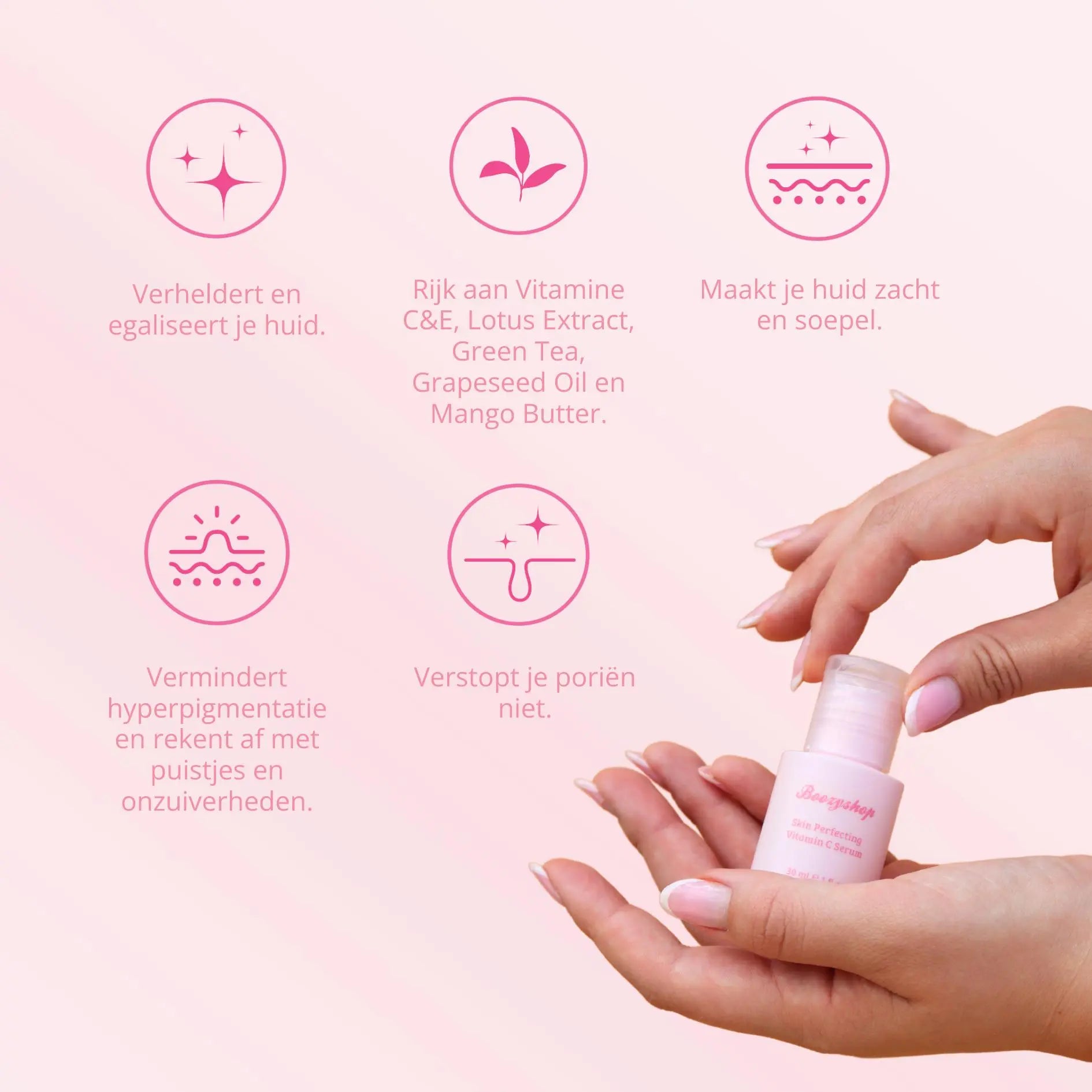 Le Boozyshop Skin Perfecting Vitamin C Serum est un sérum révolutionnaire et votre secret ultime pour une peau éclatante ! Ce puissant sérum se concentre sur l'amélioration de la santé et de l'apparence générales de votre peau et est un véritable plaisir. Porté par la puissance des vitamines C et E, ce sérum révèle un teint clair et radieux tout en combattant la brillance indésirable, les boutons et les impuretés.