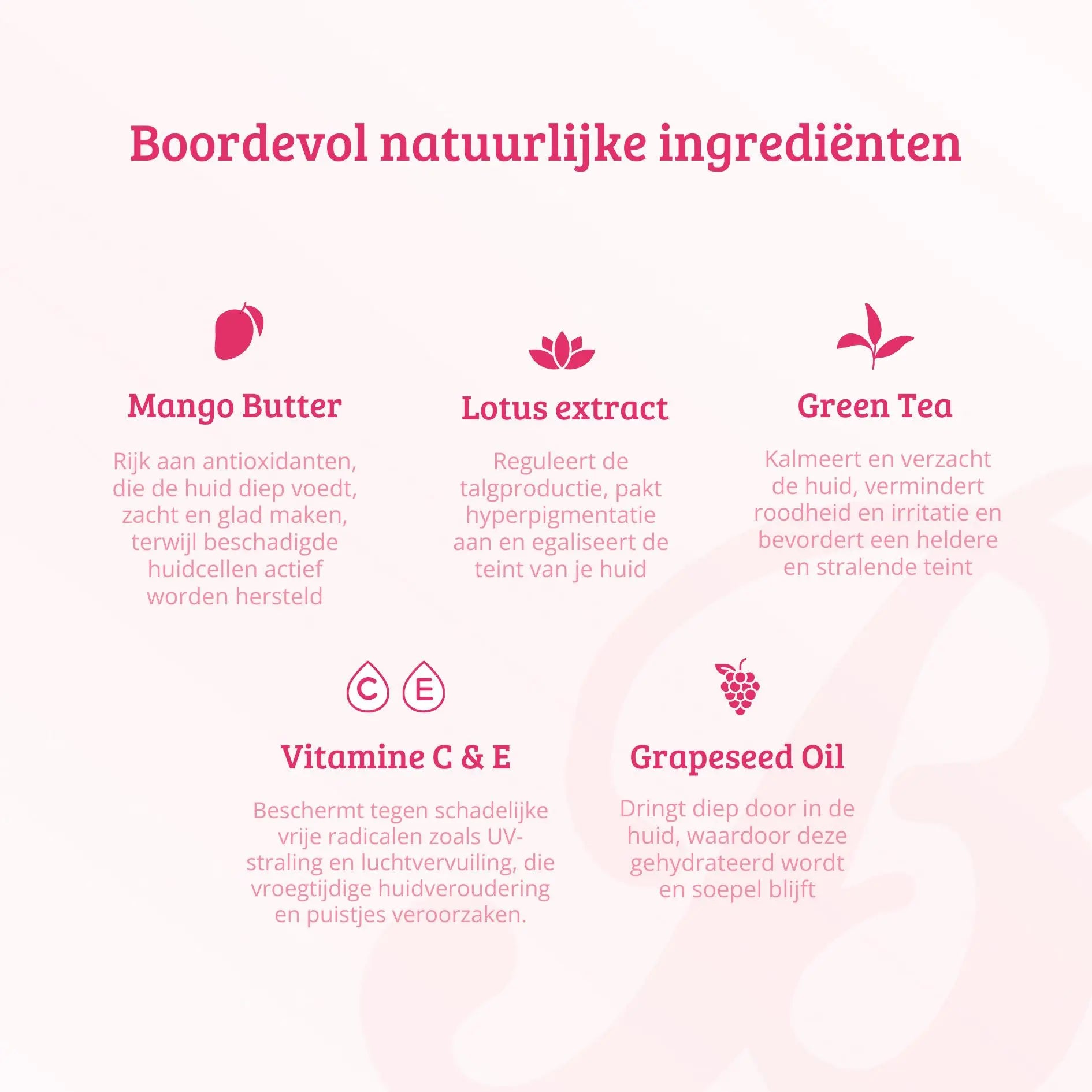 Cette combinaison ajoute un élément unique à la formule car les deux ingrédients se renforcent mutuellement. L'huile de pépins de raisin est connue pour sa texture légère, qui hydrate intensément la peau sans laisser de sensation grasse. Elle pénètre profondément dans la peau, la maintenant hydratée et souple. Le beurre de mangue, quant à lui, a une texture riche et crémeuse avec une teneur élevée en antioxydants, nourrissant la peau en profondeur, la rendant douce et lisse, tout en réparant activement les cellules cutanées endommagées. En combinant les deux ingrédients, ce sérum bénéficie à la fois des propriétés hydratantes et nourrissantes. De plus, ils travaillent ensemble pour améliorer la texture de la peau et lui donner un éclat sain et radieux. Cette combinaison unique est particulièrement efficace pour favoriser une peau saine et hydratée sans obstruer vos pores.