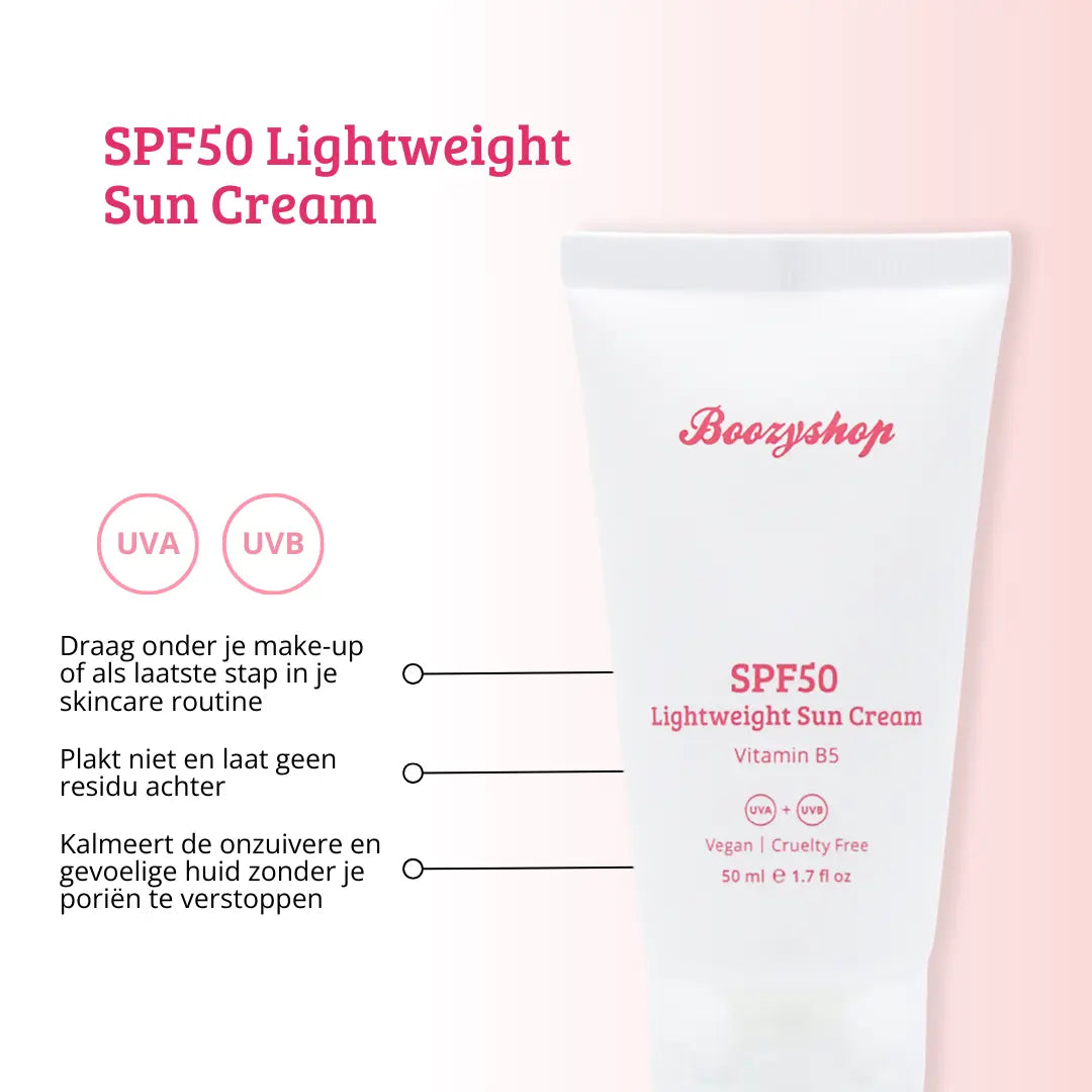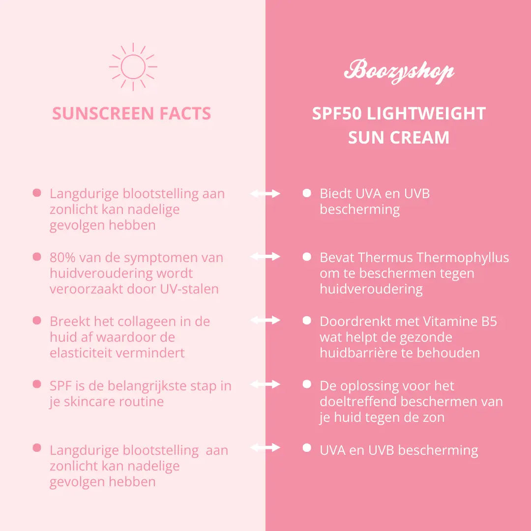 La Boozyshop SPF50 Lightweight Sun Cream offre une protection ultime grâce à la formule avancée qui protège non seulement votre peau contre les rayons UVA et UVB, mais la nourrit et l'hydrate également. Cet écran solaire léger contient une combinaison d'ingrédients de haute qualité qui forment un puissant bouclier contre les rayons UV nocifs.