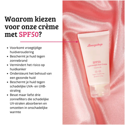 De plus, cette crème solaire ne contient pas de produits chimiques agressifs, de parfum, d'alcool, de parabènes et de gluten, ce qui en fait un choix conscient pour votre peau. Donnez à votre peau la protection et les soins qu'elle mérite avec la crème solaire légère Boozyshop SPF50. Ajoutez-le comme dernière étape de votre routine quotidienne de soins de la peau ou utilisez-le comme crème de jour. Découvrez la combinaison parfaite de protection et de soin pour une peau éclatante, au quotidien.