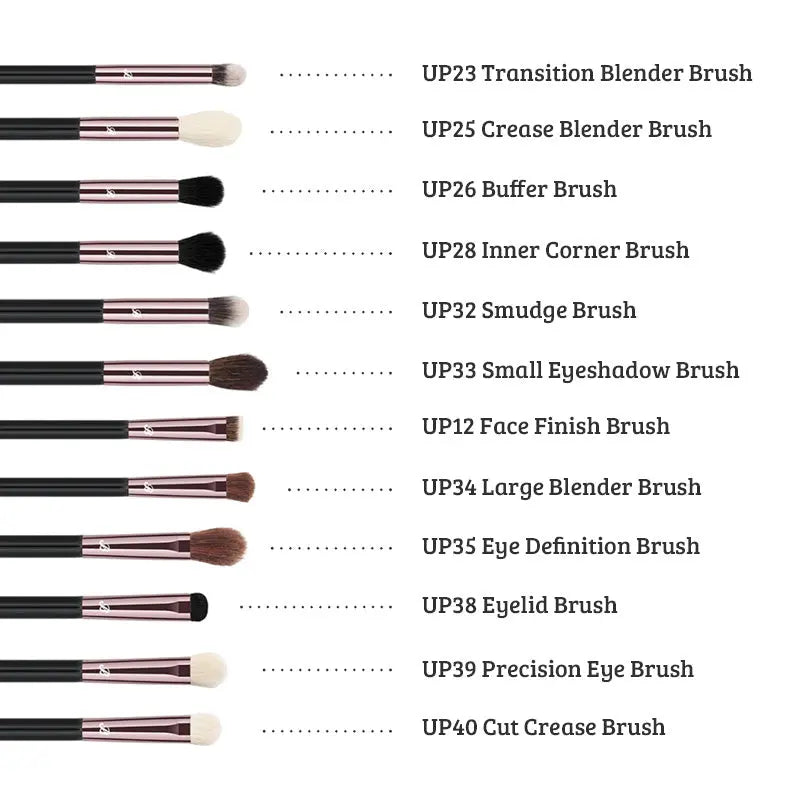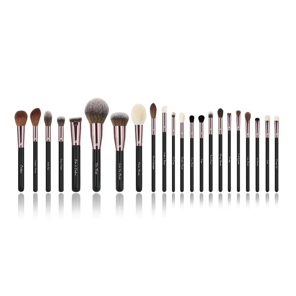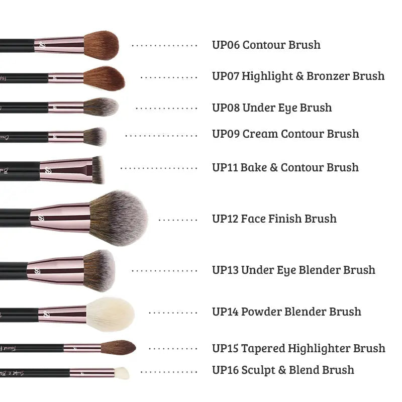 Les pinceaux ont un beau manche en bois noir brillant en combinaison avec une belle virole en aluminium doré. Cet ensemble se compose d'un mélange de pinceaux à poils d'animaux ou synthétiques et est fait pour appliquer parfaitement tout votre maquillage.