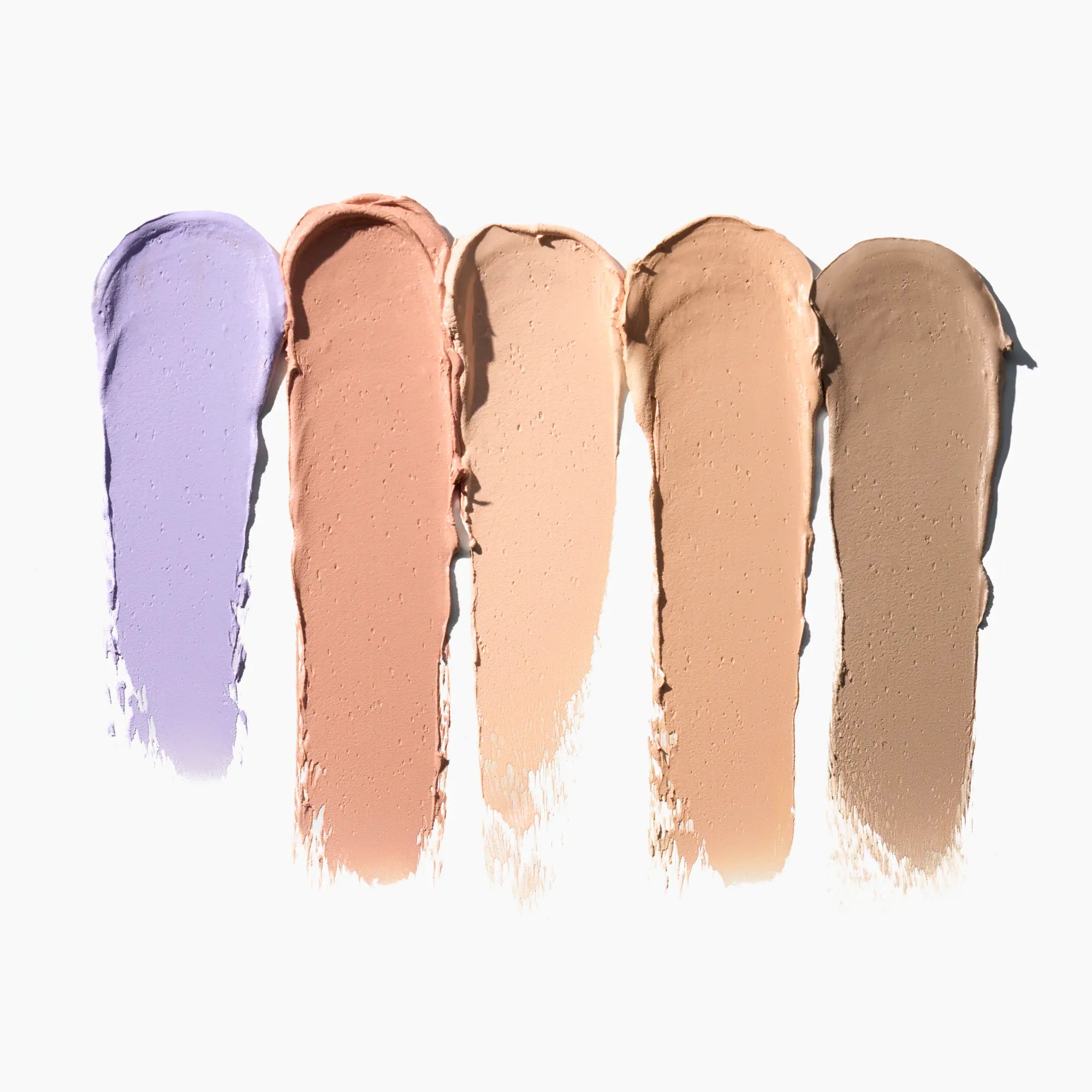 La teinte violette illumine les teints ternes et neutralise les sous-tons jaunes, tandis que la couleur pêche est parfaite pour camoufler les cernes et les taches bleutées. Les teintes beiges sont idéales pour dissimuler les imperfections, illuminer certaines zones ou apporter une couvrance supplémentaire là où c’est nécessaire. Tout se fond parfaitement pour un fini mat longue tenue qui ne file pas dans les ridules. Que tu fasses une retouche rapide ou que tu crées une base full glam : cette palette est ton alliée multitâche !