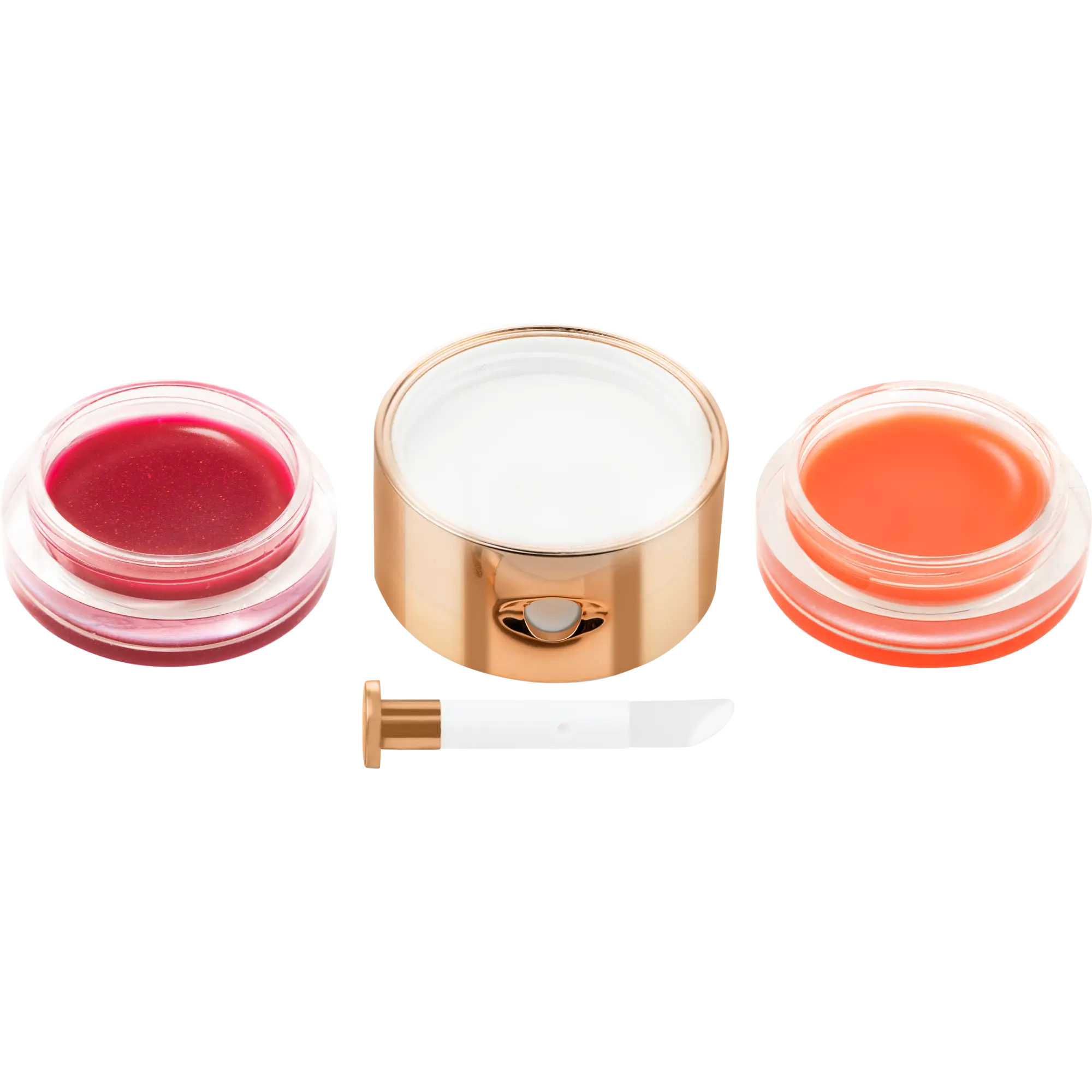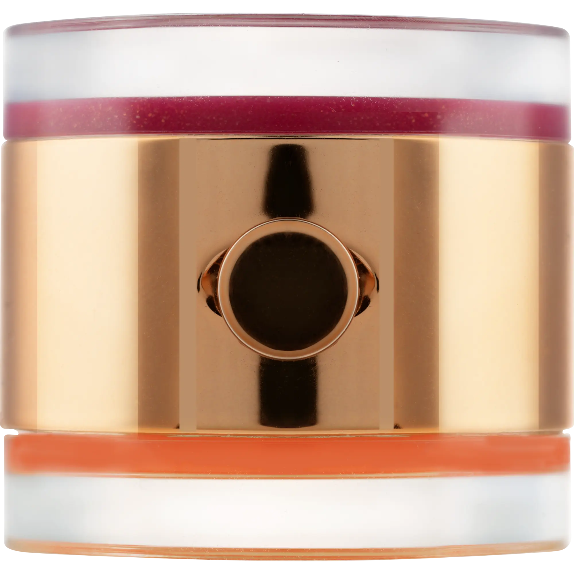 Dans le compartiment supérieur, vous trouverez un baume rose avec des nacres qui donne immédiatement un glow juteux grâce à l’hyaluronic acid. Dans le compartiment inférieur, une formule orangée et huileuse apaise et nourrit vos lèvres pendant la nuit. Et l’applicateur ? Il est astucieusement caché au centre de l'emballage. Parfait pour une retouche en déplacement !