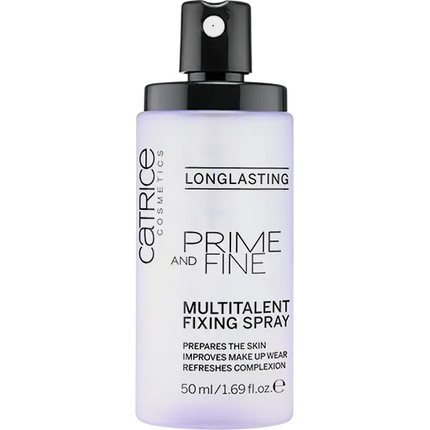 The Catrice Prime And Fine Multitalent Fixing Spray est un spray transparent à séchage rapide. Ce spray peut être utilisé comme base, mais aussi pour fixer votre maquillage. Si votre peau a besoin d'un coup de pouce, ce spray fait également des merveilles. Un boost de fraîcheur se distribue sur votre peau !