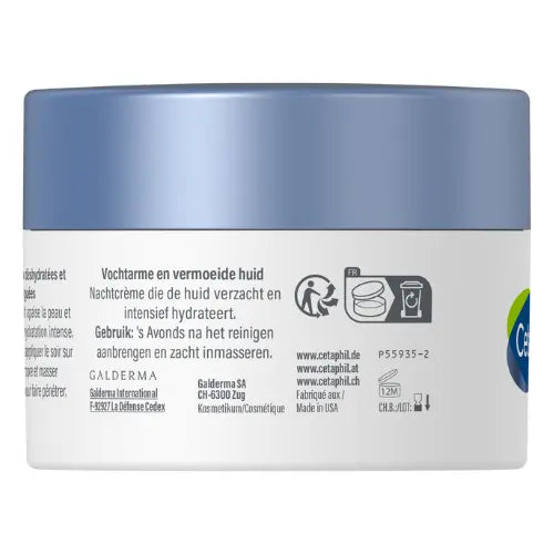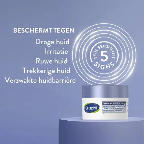 Dorlotez votre peau avec la crème de nuit réparatrice hydratation optimale Cetaphil et réveillez-vous avec une peau plus lisse après seulement une semaine. Développée en collaboration avec des dermatologues, des scientifiques et des experts, cette crème de nuit vise à protéger contre les cinq signes des peaux sensibles : sécheresse, irritation, rugosité, tiraillements et barrière cutanée fragilisée. Donnez à votre peau les soins affectueux qu'elle mérite !