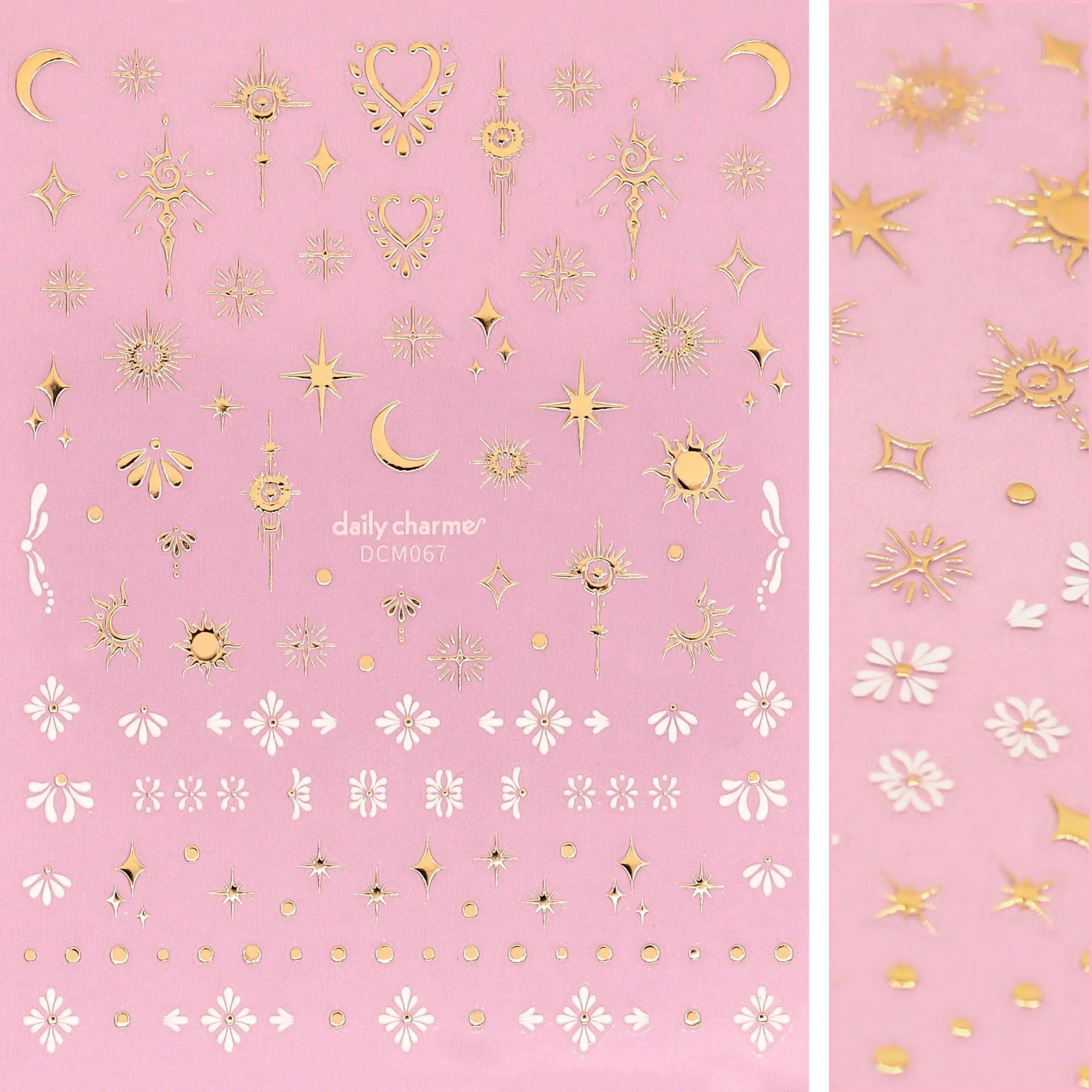 Le Daily Charme 3D Embossed Nail Art Sticker Celestial Element apporte une touche magique à ta manucure avec un mélange de designs dorés métalliques et blancs mats. Cette planche est remplie de soleils, lunes, étoiles, étincelles, points, éléments tribaux et petites fleurs abstraits.