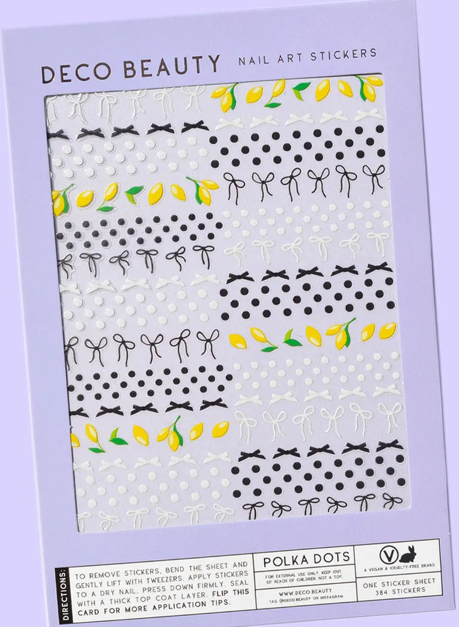 Les Deco Beauty Nail Art Stickers Polka Dots rendent votre manucure parfaitement facile. Des pois nets combinés avec des citrons et des nœuds créent un look intemporel avec une touche ludique. Cute, frais et toujours on point.