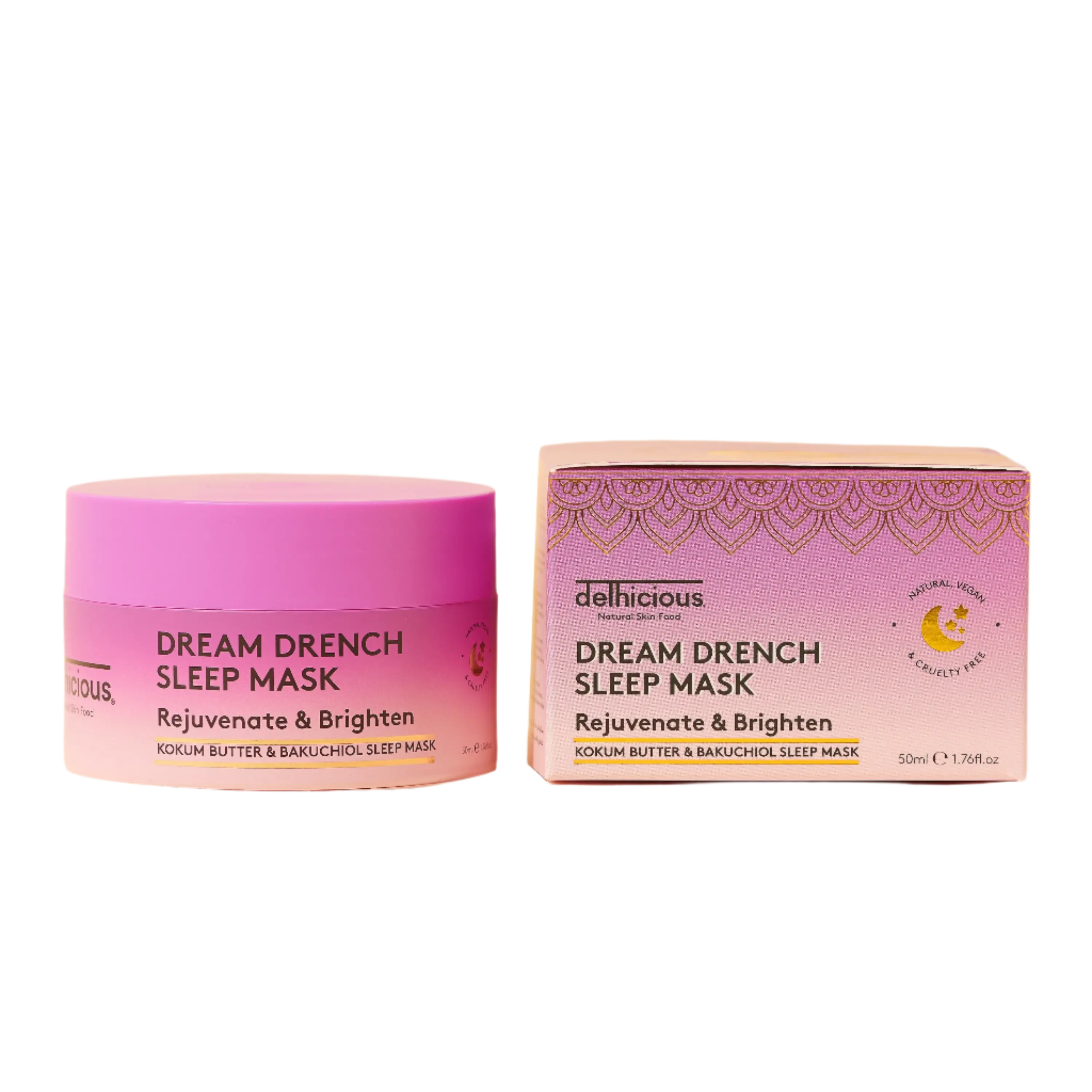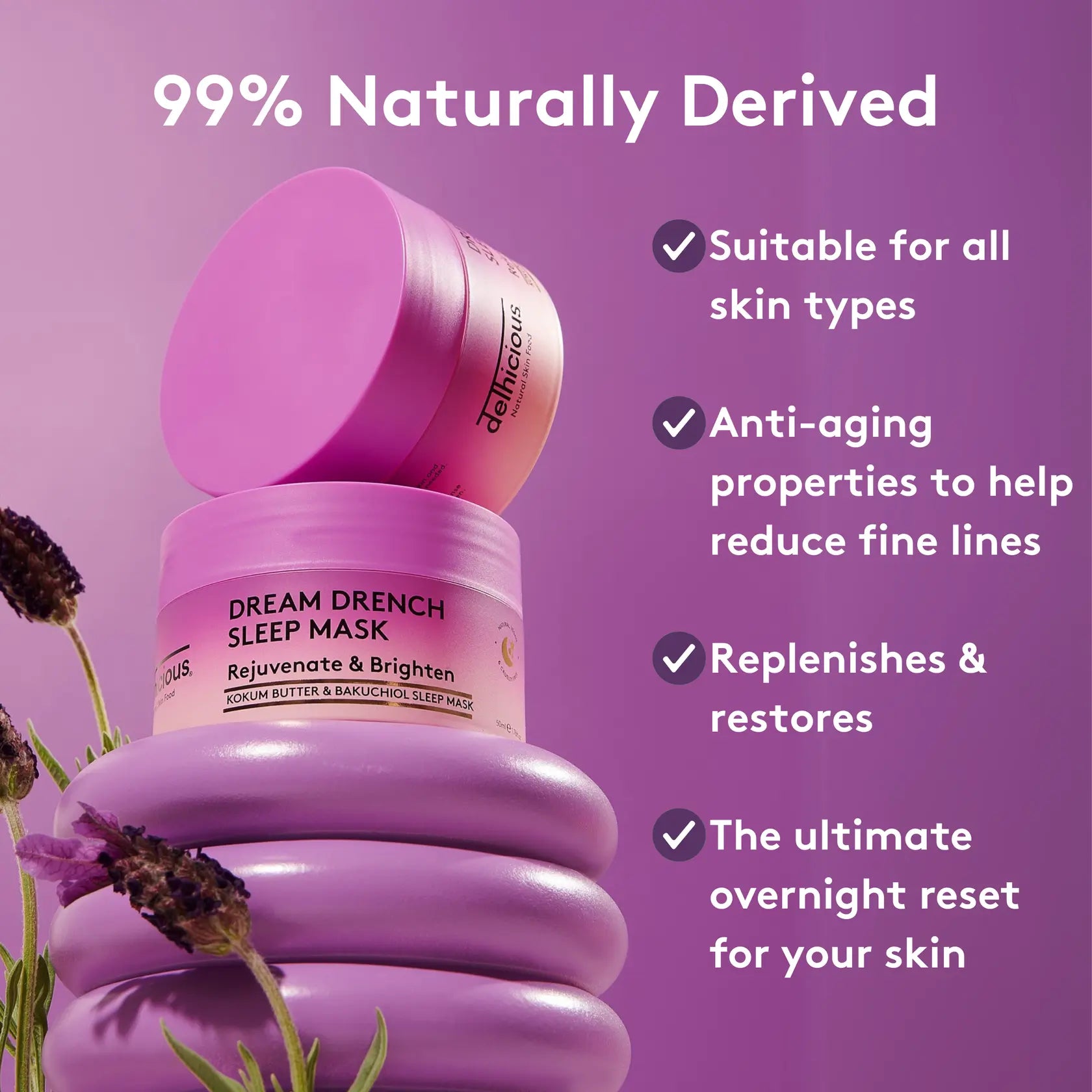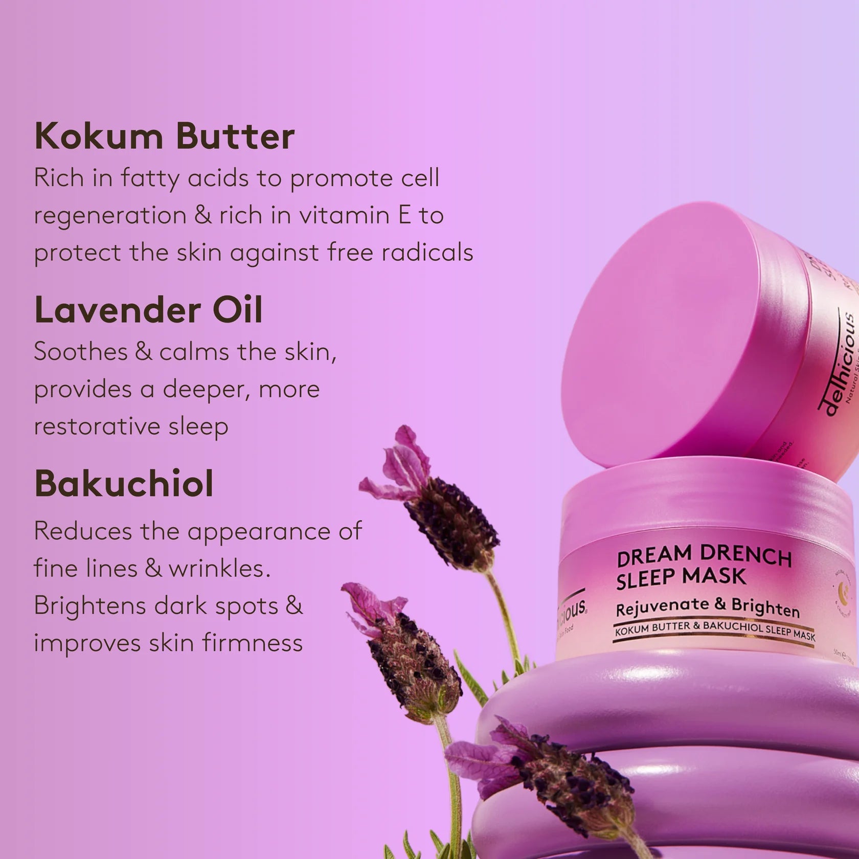 Le Delhicious Dream Drench Sleep Mask est votre soin de nuit ultime pour une peau éclatante et régénérée au réveil ! Ce masque de nuit luxueux nourrit et apaise intensément la peau grâce à un puissant mélange de beurre de kokum, d’huile de lavande et de bakuchiol, une alternative naturelle au rétinol.