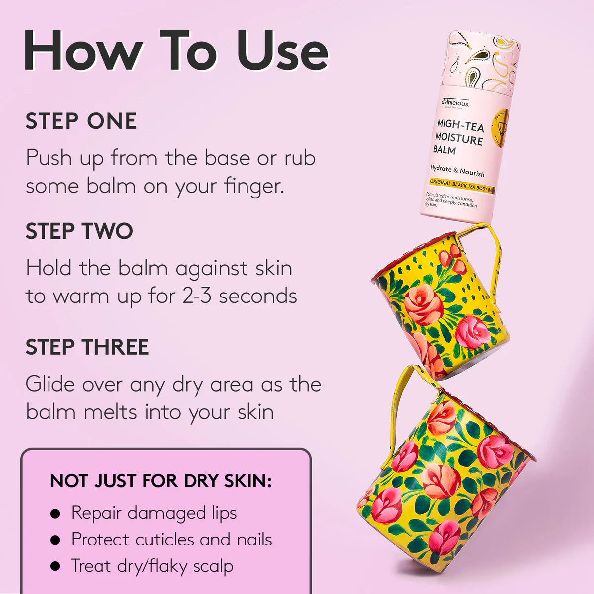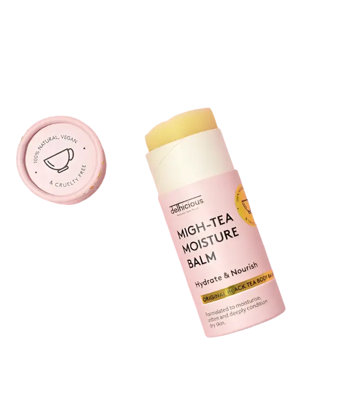 Le Delhicious Migh-Tea Moisture Body Balm Original est un baume pour le corps intensément nourrissant qui donne un vrai coup de boost à la peau sèche. Enrichi en caféine issue du thé noir Assam indien aux propriétés anti-inflammatoires, ce baume pénètre rapidement et soulage immédiatement les tiraillements. Sa formule apaise les rougeurs et hydrate durablement pour une peau douce et soyeuse.