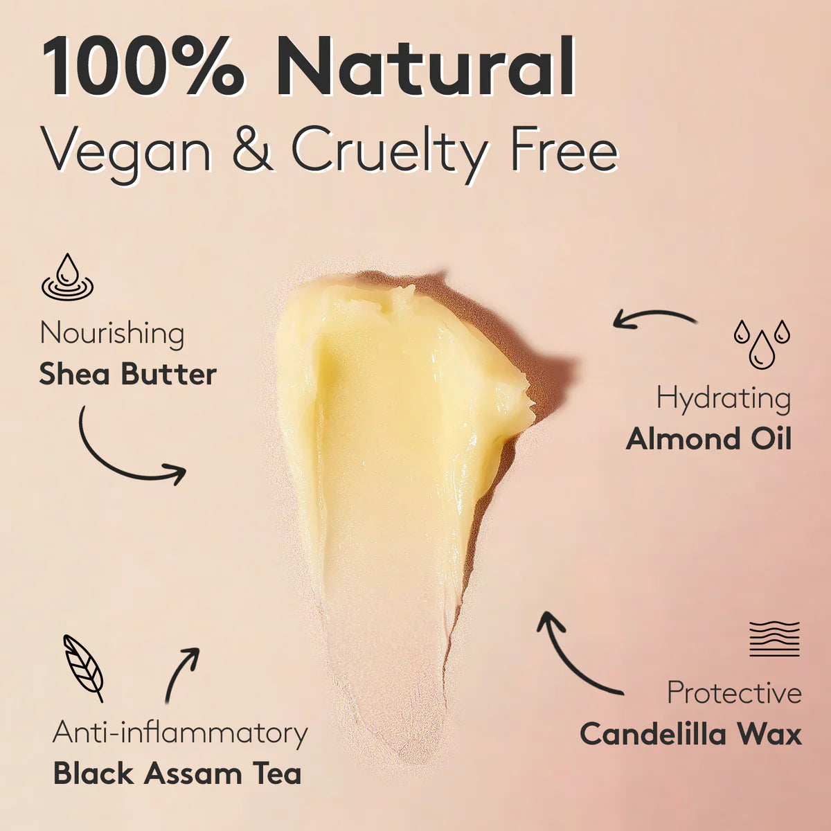 Butyrospermum Parkii (Beurre de Karité), Prunus Amygdalus Dulcis (Huile d’Amande Douce), Candelilla Cera (Cire de Candelilla), Camellia Sinensis Leaf (Thé Noir Assam).