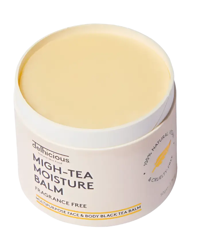 Le Delhicious Migh-Tea Moisturise Multipurpose Balm Fragrance Free a été spécialement conçu pour les peaux les plus sensibles. Cette version sans parfum du baume primé procure un soulagement immédiat et durable des tiraillements et de la sécheresse – idéale pour le visage et le corps. Grâce à la caféine du thé noir Assam, les rougeurs et irritations sont efficacement apaisées. Le baume fond délicatement sur la peau et la laisse douce, souple et nourrie.