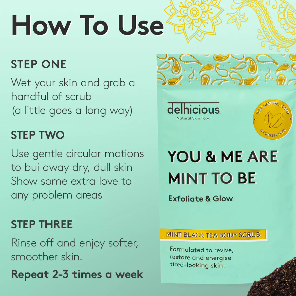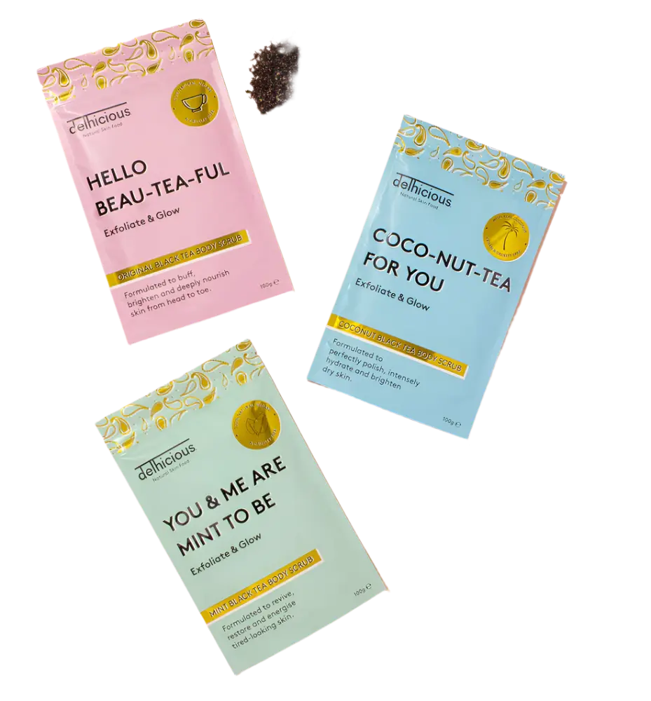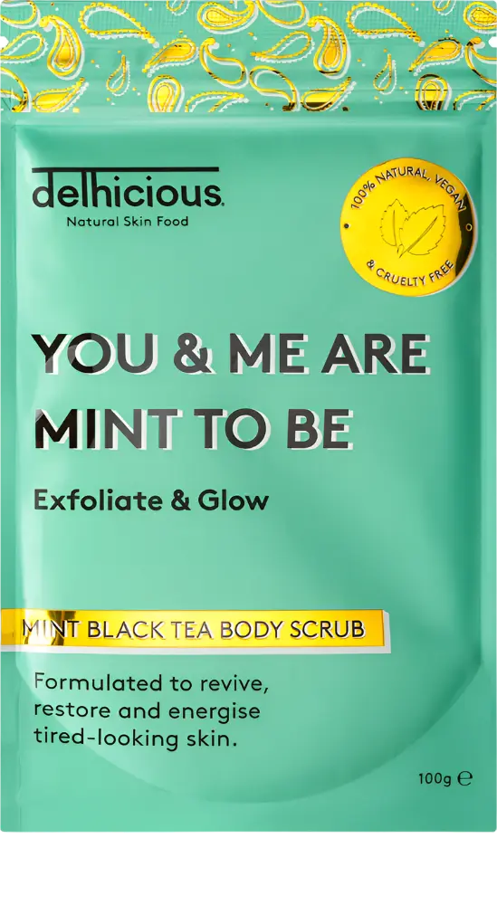 Le Delhicious Mint Black Tea Body Scrub est un gommage corporel rafraîchissant à la menthe qui rend votre peau immédiatement plus douce et plus lisse ! Ce gommage naturel associe des ingrédients exfoliants aux antioxydants du thé noir Assam indien et à l’huile de menthe poivrée apaisante. Idéal pour les peaux sèches, ternes ou sujettes à la kératose pilaire.