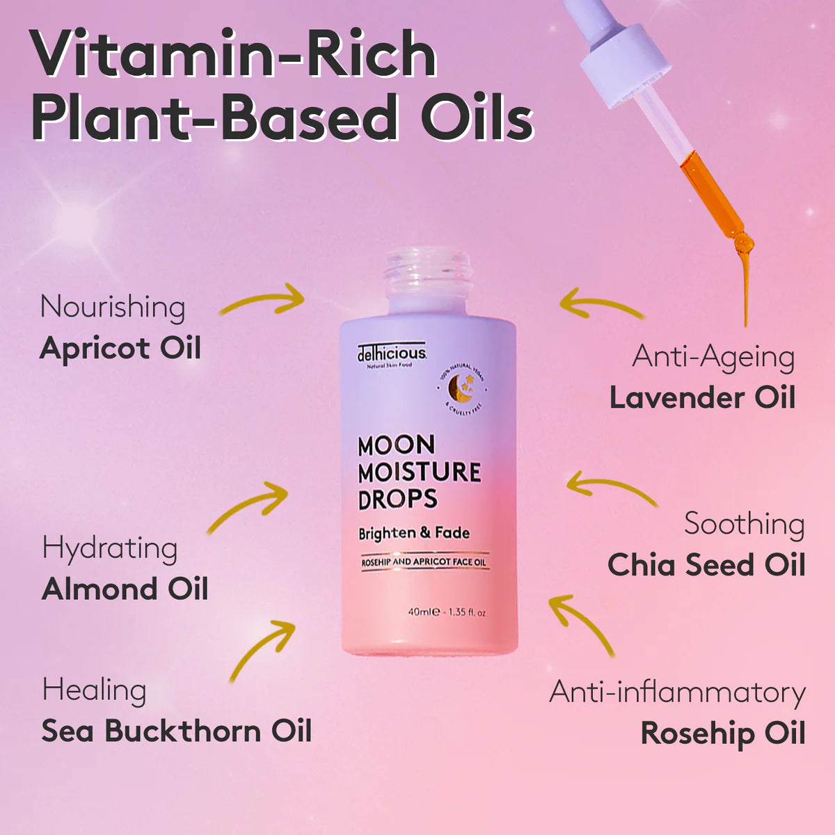 L’huile visage Delhicious Moon Moisture Drops est ton soin de nuit ultime pour une peau hydratée et lumineuse ! Cette huile légère et à absorption rapide est composée à 100 % d’huiles végétales pures, soigneusement sélectionnées pour cibler la sécheresse, le teint terne et la texture irrégulière de la peau.