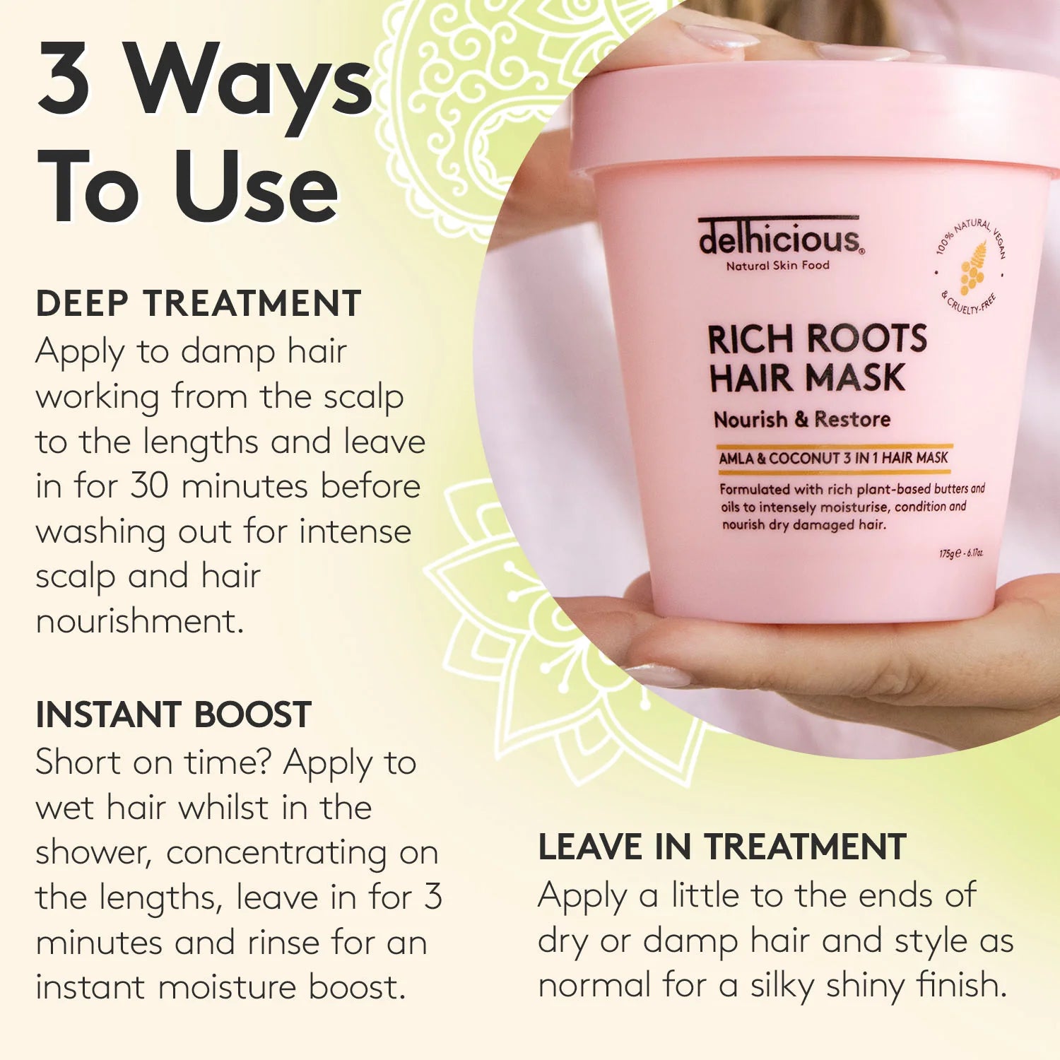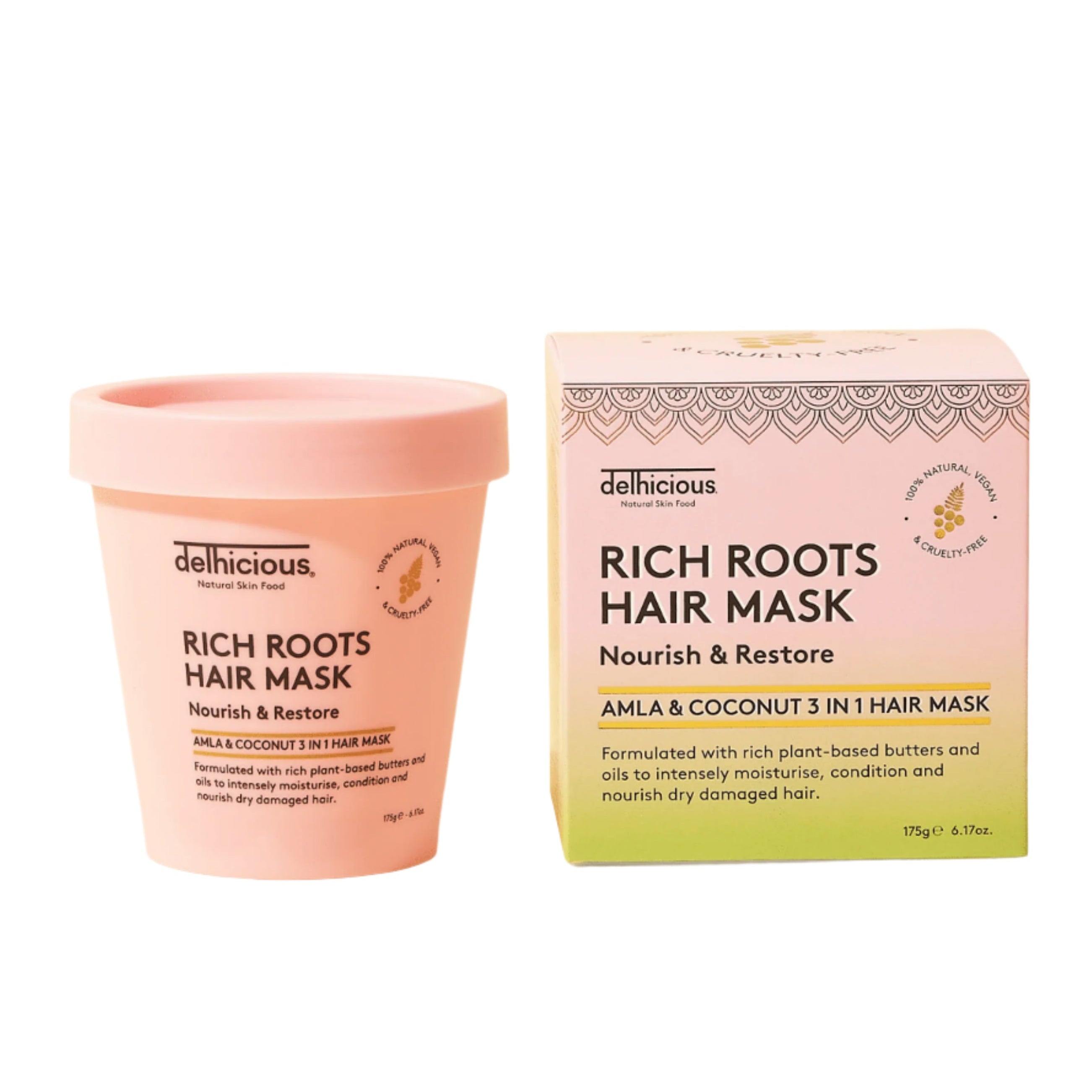 Le Delhicious Rich Roots 3-in-1 Nourishing Hair Mask Amla & Coconut est un véritable héros capillaire en pot ! Ce soin riche et nourrissant offre à vos cheveux une hydratation intense, de la brillance et de la force – le tout grâce à la puissance naturelle de l’amla indien et de l’huile de coco. Besoin d’un soin profond, d’un boost express ou d’un soin sans rinçage ? Ce masque sait tout faire !