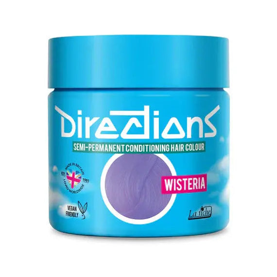 Directions Color #Wisteria est une coloration semi-permanente dans une teinte lavande-lilas douce qui apporte une touche pastel rêveuse à tes cheveux. Cette couleur subtile aux sous-tons froids est parfaite pour un look romantique et raffiné, aussi élégant que la fleur qui lui donne son nom.