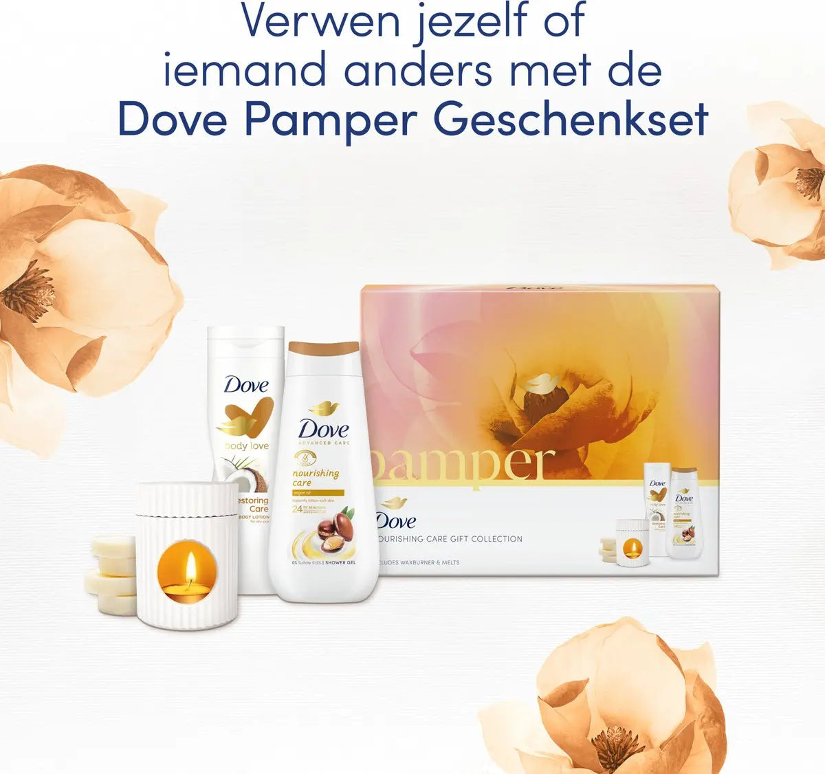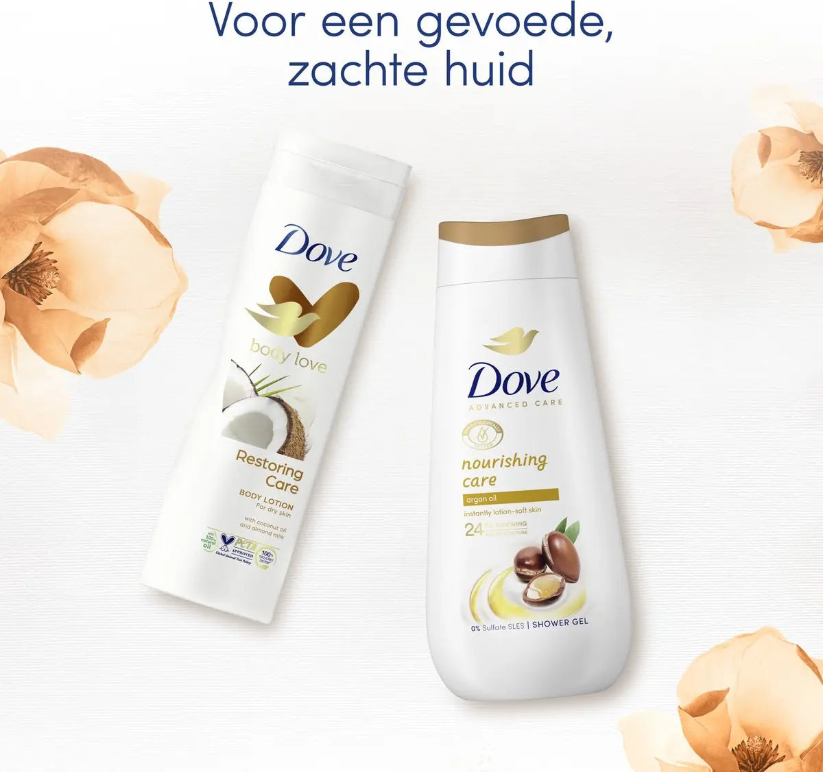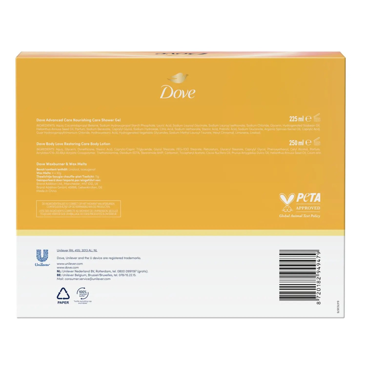 Dove Bodylotion (400 ml.) : Aqua, Glycerin, Dimethicone, Stearic Acid, Caprylic/Capric Triglyceride, Glycol Stearate, Stearate, Petrolatum, Glyceryl Stearate, Caprylyl Glycol, Phenoxyethanol, Cetyl Alcohol, Parfum, Acrylates/C10-30 Alkyl Acrylate Crosspolymer, Triethanolamine, Disodium EDTA, Stearamide AMP, Carbomer, Cocos Nucifera Oil, Tocopheryl Acetate, Prunus Amygdalus Dulcis Seed Extract, Helianthus Annuus Seed Oil, PEG-40 Hydrogenated Castor Oil, Sine Adipe Lac, Isomerized Linoleic Acid, Prunus Amygdalus Dulcis Oil, Citric Acid, Coumarin, CI 77891.