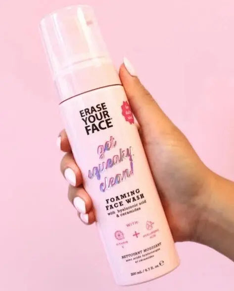 Le Erase Your Face Foaming Face Wash Vitamin C & Hyaluronic Acid est ton moment de fraîcheur quotidien en flacon ! Ce nettoyant moussant doux convient à tous les types de peau, oui, même les peaux sensibles, et élimine efficacement le maquillage, les impuretés et l’excès de sébum. Sa texture mousse légère est agréable sur le visage et laisse la peau fraîche, douce et intensément hydratée.