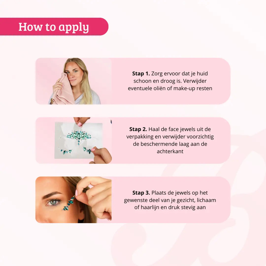 Placez les bijoux sur la partie souhaitée de votre visage, de votre corps ou de la racine des cheveux et appuyez fermement. Vous êtes prêt à briller !
