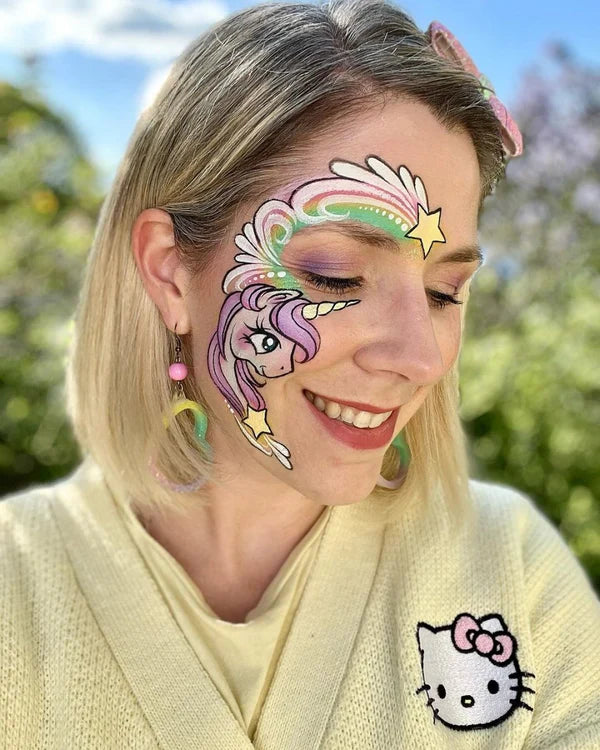 La peinture s’active avec de l’eau, glisse facilement sur la peau et sèche rapidement sans baver. Grâce à sa forte pigmentation, les couleurs sont éclatantes dès la première couche. Idéale pour des designs arc-en-ciel, des licornes, des couronnes de fleurs, des animaux mignons ou encore des looks féériques. Et oui, elle convient même aux peaux sensibles !