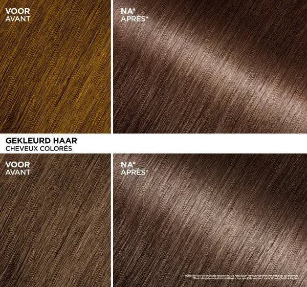 - Appliquez sur cheveux propres et mouillés et portez des gants.