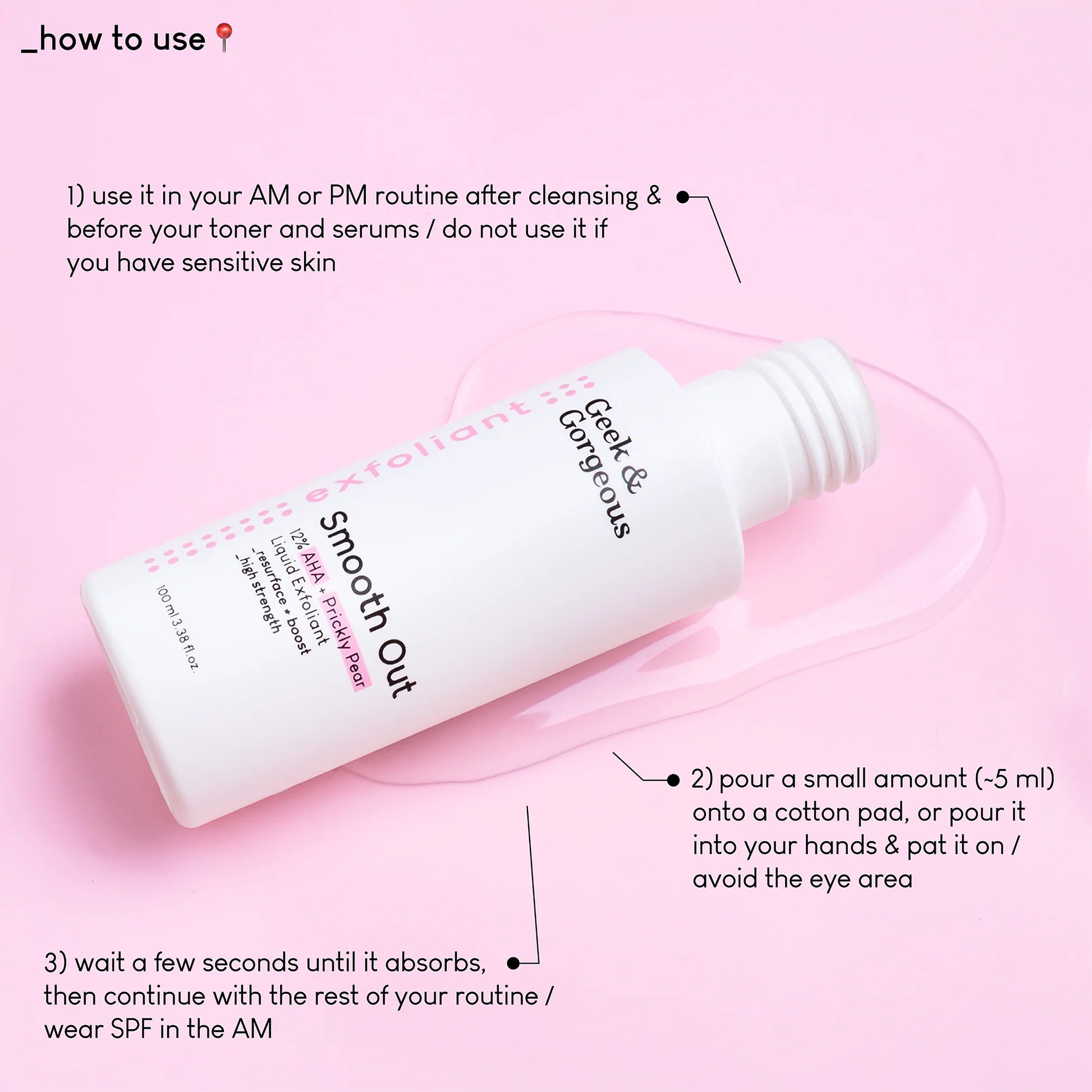 Le Geek & Gorgeous Smooth Out AHA Exfoliant est un exfoliant liquide qui élimine en douceur les cellules mortes de votre peau et procure un éclat naturel ! L'exfoliant convient à tous les types de peau, mais peut être assez agressif pour les peaux sensibles. Vous utilisez cet exfoliant lorsque vous souffrez de peau terne, de ridules, de cernes et de taches sur votre peau.