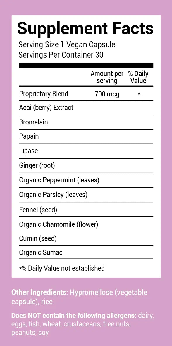 Acai Berry, Organic Sumac, Bromelain, Papain, Lipase, Ginger, Organic Peppermint, Organic Parsley, Fennel Seed, Organic Chamomile, Cumin.