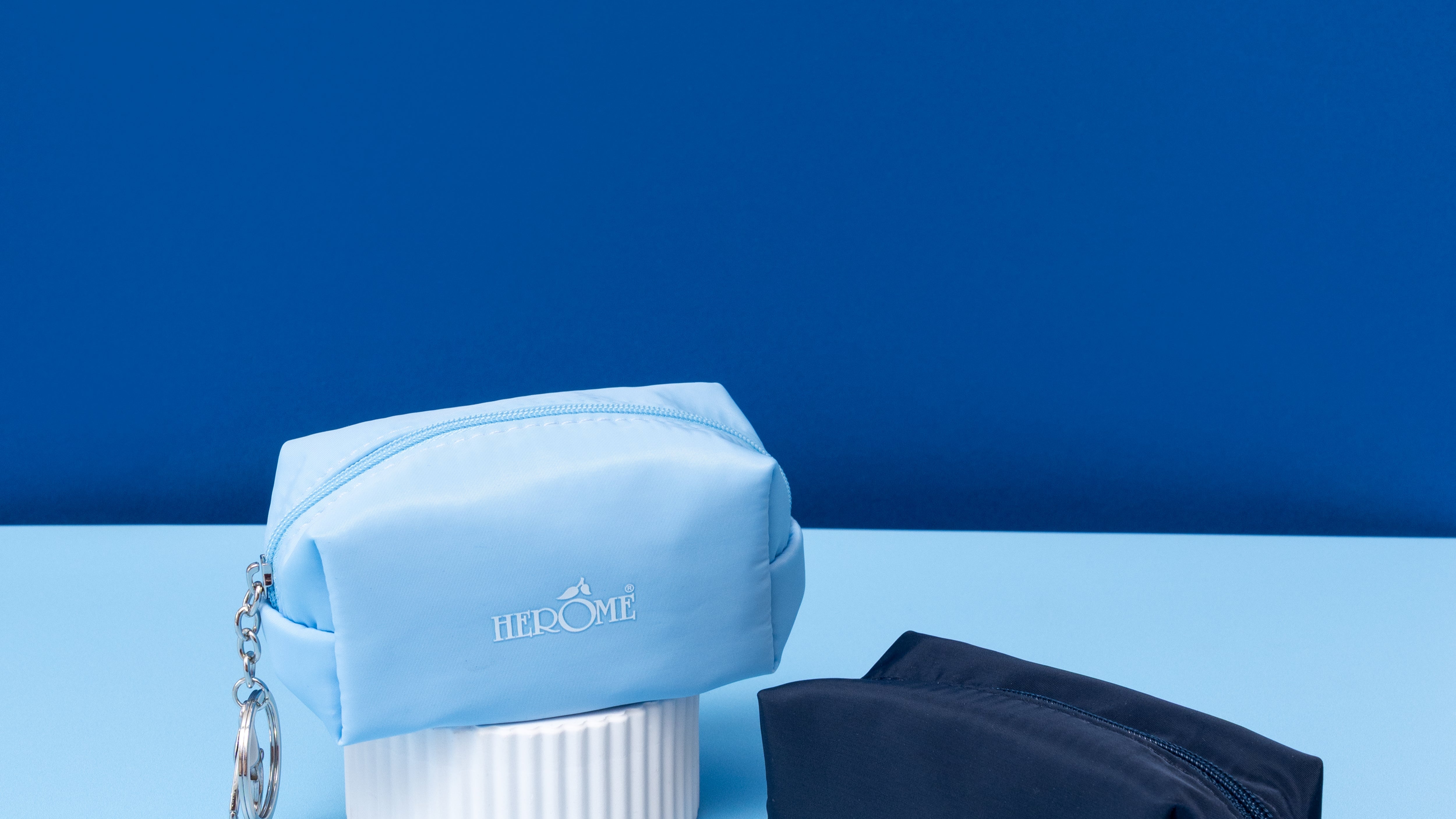 Le Herôme Keychain est le mini accessoire parfait pour garder vos essentiels beauté toujours à portée de main. Cette adorable trousse avec porte-clés est disponible en bleu clair: assez compacte pour être emportée partout, mais assez spacieuse pour contenir vos indispensables beauté.