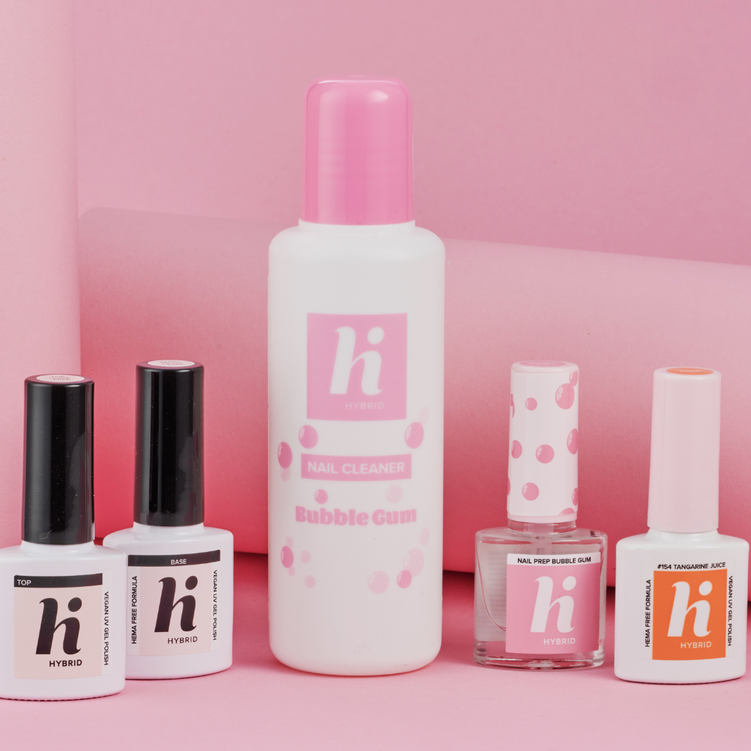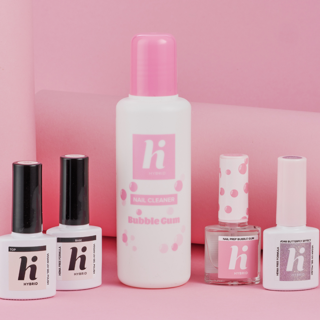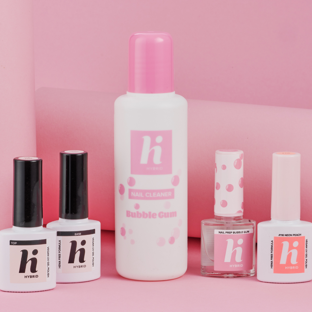 Nettoie avec le Hi Hybrid Bubble Gum Nail Cleaner.