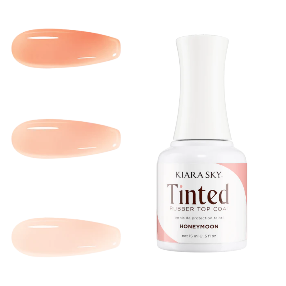 Le Kiara Sky Tinted Rubber Top Coat Honeymoon est le mélange parfait de couleur, de brillance et de renforcement en une seule étape ! Cette teinte pêche claire et chaude avec des sous-tons abricotés offre à vos ongles une légère brillance ou une couvrance plus intense – à vous de choisir l’intensité désirée. Que vous optiez pour une teinte discrète ou un effet lever de soleil doux : Honeymoon apporte un effet rêveur à votre manucure.
