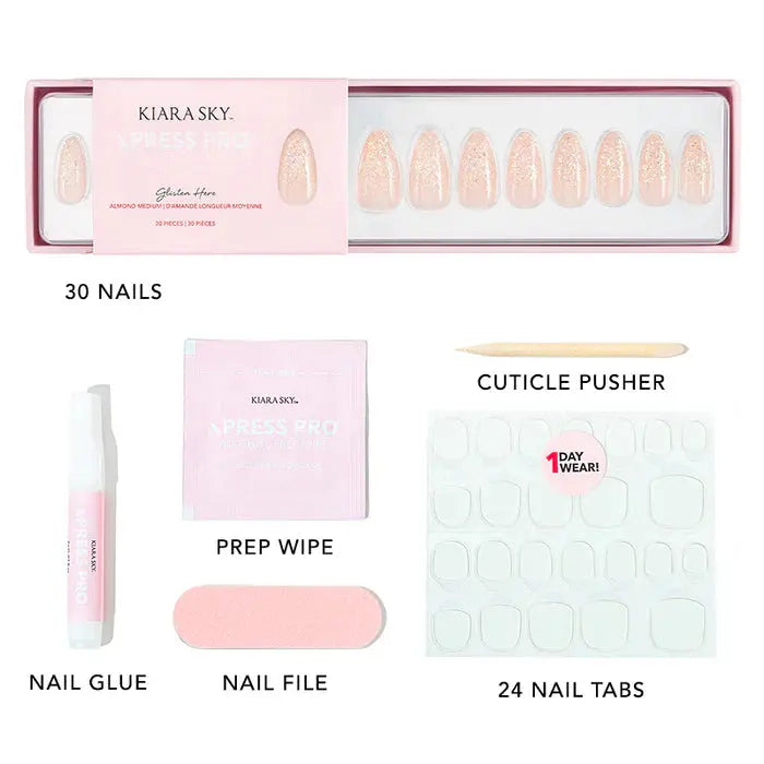 Les Kiara Sky xPress Pro Press-on Nails Glisten Here sont ton choix idéal si tu recherches une manucure glitter ombrée qui ne passe pas inaperçue. Ce set associe une élégante teinte beige qui convient à toutes les carnations à une pointe dorée scintillante pour un effet waouh instantané. Que tu les portes pour une fête, un brunch ou simplement parce que tu veux des ongles fabuleux, ce set te fera briller !