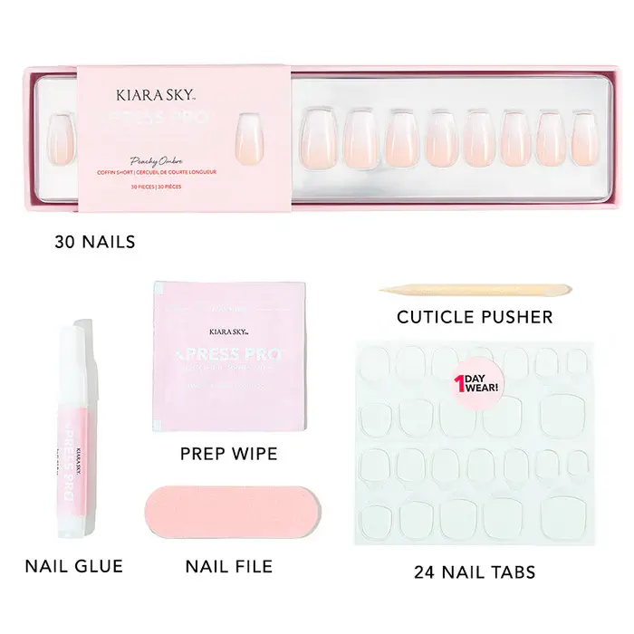 Les Kiara Sky xPress Pro Press-on Nails Peachy Ombre sont les babyboomer nails de vos rêves. Ce look ombré pêche subtil est à la fois moderne et doux, et convient à toutes les humeurs, tenues et occasions. La teinte pêche flatteuse se fond parfaitement dans une pointe blanche fraîche pour un résultat salon parfait, sans rendez-vous.