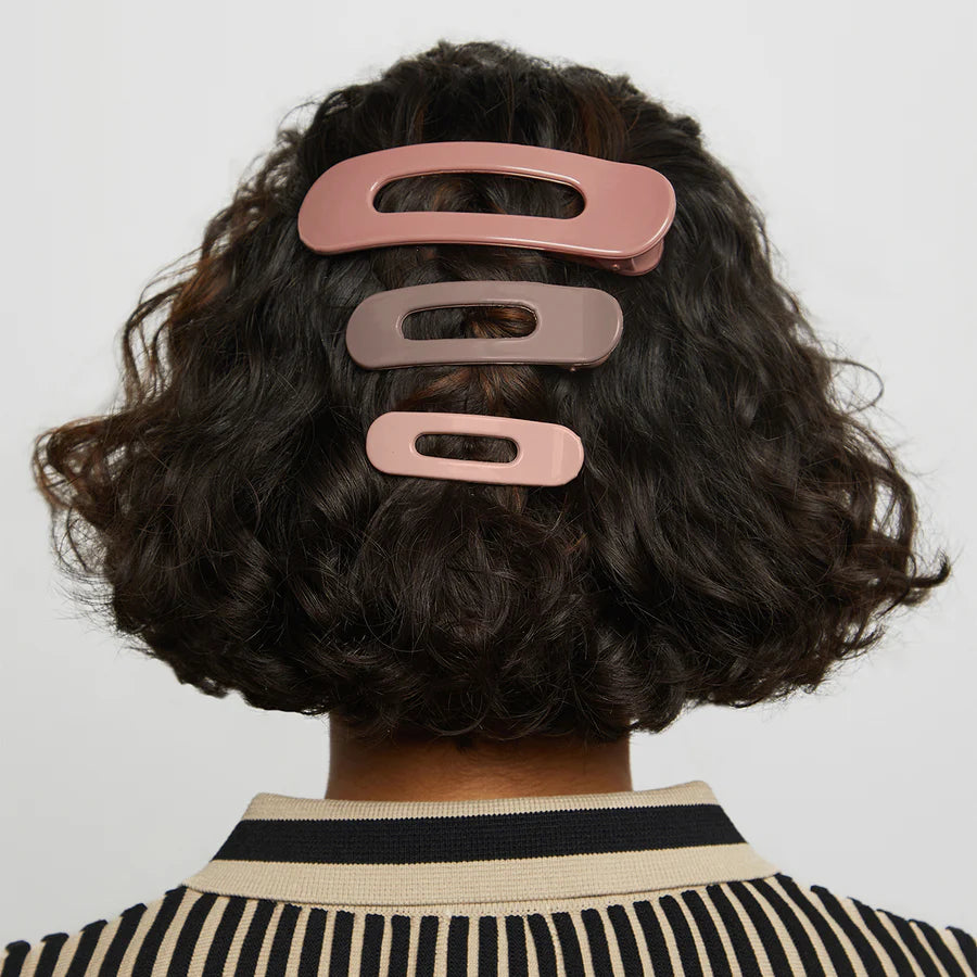 Grâce aux trois tailles différentes, il y a toujours une pince adaptée à votre style du jour. La petite est idéale pour la frange, la moyenne pour un look half up et la grande pour attacher les cheveux en un seul mouvement. En plus, elles sont fabriquées à partir de plastique recyclé pour un choix à la fois stylé et responsable.