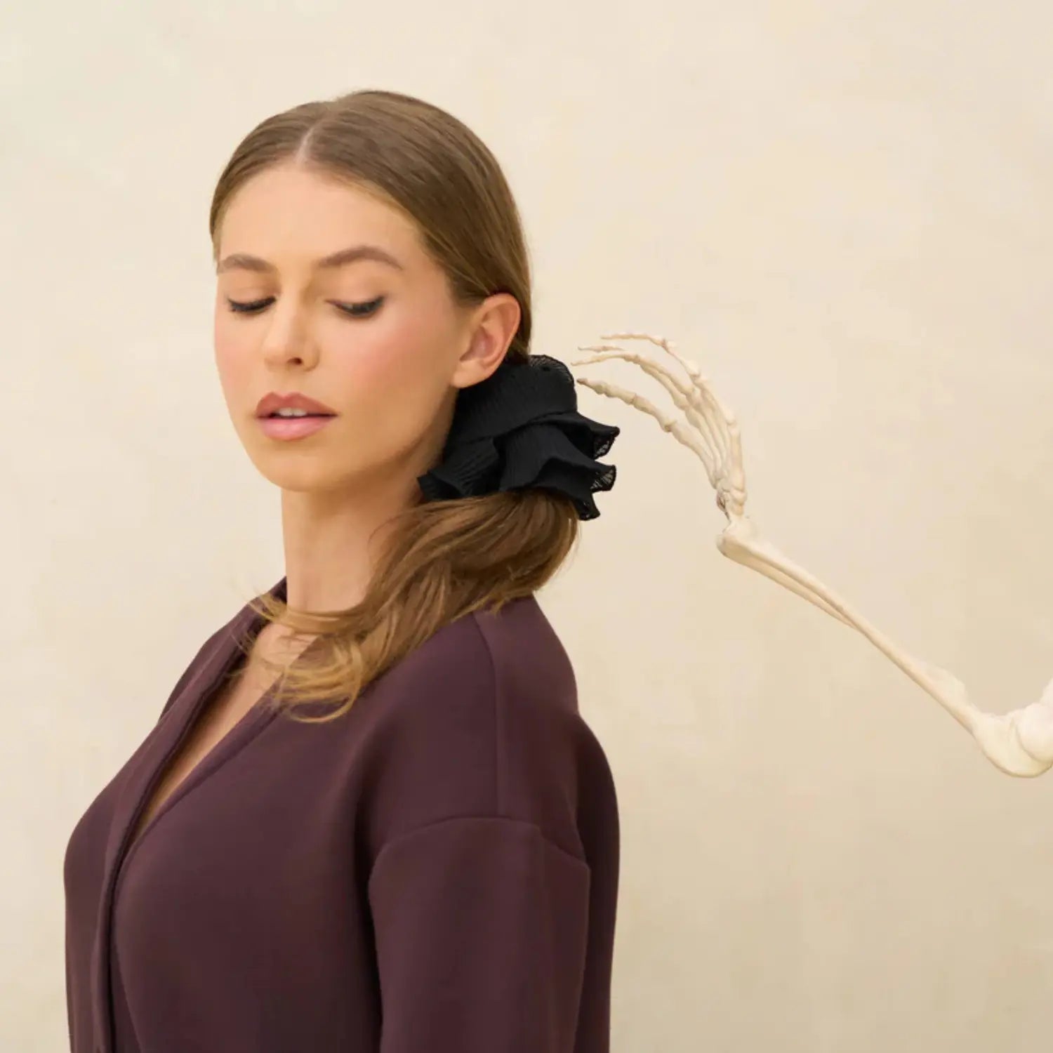 Sa couleur noire intense et ses plis dramatiques apportent une touche audacieuse et mystérieuse à chaque look. Douce pour les cheveux mais suffisamment solide pour tout maintenir en place sans tirer ni abîmer. Porte-la en queue-de-cheval, en chignon ou simplement autour du poignet comme accessoire statement. Parfaite pour les tenues d’Halloween, mais aussi une touche chic tout au long de l’année !