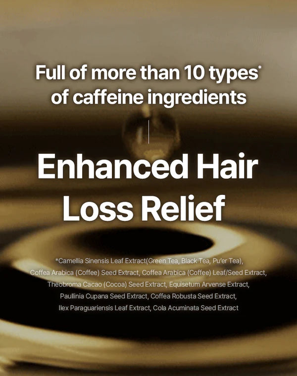 Purified Water, Cetearyl Alcohol, Propylene Glycol, Dimethicone, Steartrimonium Chloride, Glycerin, Caffeine, C13-15 Alkane, Glyceryl Stearate SE, Menthol, PG-45M, Hydroxyacetophenone, Sodium Benzoate, Hydroxypropyl Starch Phosphate, Polyquaternium-37, Cetrimonium Chloride, Propylene Glycol Dicaprylate/Dicaprate, Trideceth-12, Quaternium-80, Citric Acid, PPG-Trideceth-6, Ethylhexylglycerin, Disodium EDTA, Dimethiconol, Butylene Glycol, Dodecanediol, Amodimethicone, Acrylates/Stearyl Acrylate Copolymer, Indian Mulberry Flower Extract, Holy Basil Leaf Extract, Indian Gooseberry Leaf Extract, Cocoa Seed Extract, Gold Root Extract, Chamomile Extract, Sodium Chloride, Black Bean Extract, Olive Oil, Coffee Bean Oil, Hydrolyzed Vegetable Protein, Jujube Extract, Willow Bark Extract, Oregano Extract, Cypress Extract, Golden Root Extract, Lactobacillus Ferment Extract, Broussonetia Bark Extract, Korean Pine Leaf Extract, Angelica Root Extract, Evening Primrose Flower Extract, Green Tea Extract, Caprylyl Glycol, Polyglyceryl-10 Laurate, Guarana Seed Extract, Mate Leaf Extract, Iron Extract, Cola Tree Seed Extract, Robusta Coffee Seed Extract, Coffee Bean Extract, Coffee Leaf/Seed Extract, Black Tea Extract, Boy Tea Extract, Gosang Root Extract, Strawberry Fruit Extract, Sanguisorba Root Extract, Mulberry Root Extract, Goji Extract, Dongwol Root Extract, Red Pepper Extract, Chamdanggui Root Extract, Burdock Root Extract, Palmitoyl Tripeptide-4, Palmitoyl Pentapeptide-4, Hexapeptide-3, Acetyl Hexapeptide-8, Tripeptide-1, Copper Tripeptide-1, Geraniol, Linalool, Fragrance (White Musk).