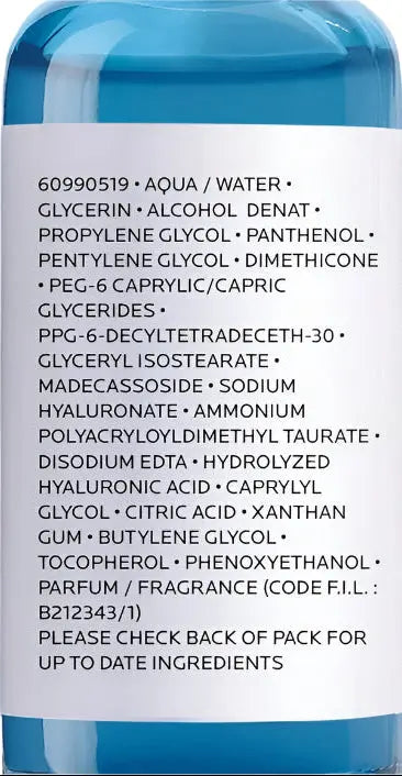 Aqua / Water, Glycerin, Alcohol Denat., Propylene Glycol, Panthenol, Pentylene Glycol, Dimethicone, PEG-6 Caprylic/Capric Glycerides, PPG-6-Decyltetradeceth-30, Glyceryl Isostearate, Madecassoside, Sodium Hyaluronate, Ammonium Polyacryloyldimethyl Taurate, Disodium EDTA, Hydrolyzed Hyaluronic Acid, Caprylyl Glycol, Citric Acid, Xanthan Gum, Butylene Glycol, Tocopherol, Phenoxyethanol, Parfum / Fragrance.