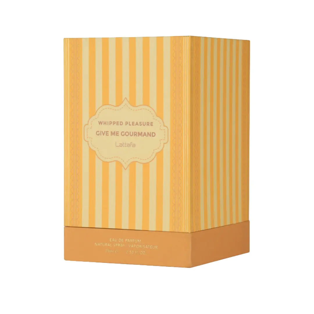 Lattafa Give Me Gourmand Whipped Pleasure Eau de Parfum inspiré de Cheirosa 71 c’est le confort pur en flacon imaginez des couvertures douces, une ambiance cosy et une belle touche de chantilly. Ce délicieux parfum gourmand s’ouvre sur du caramel popcorn sucré et une note de caramel salé. Ensuite, une touche lactée douce se mêle à un léger soupçon fleuri de jasmin.