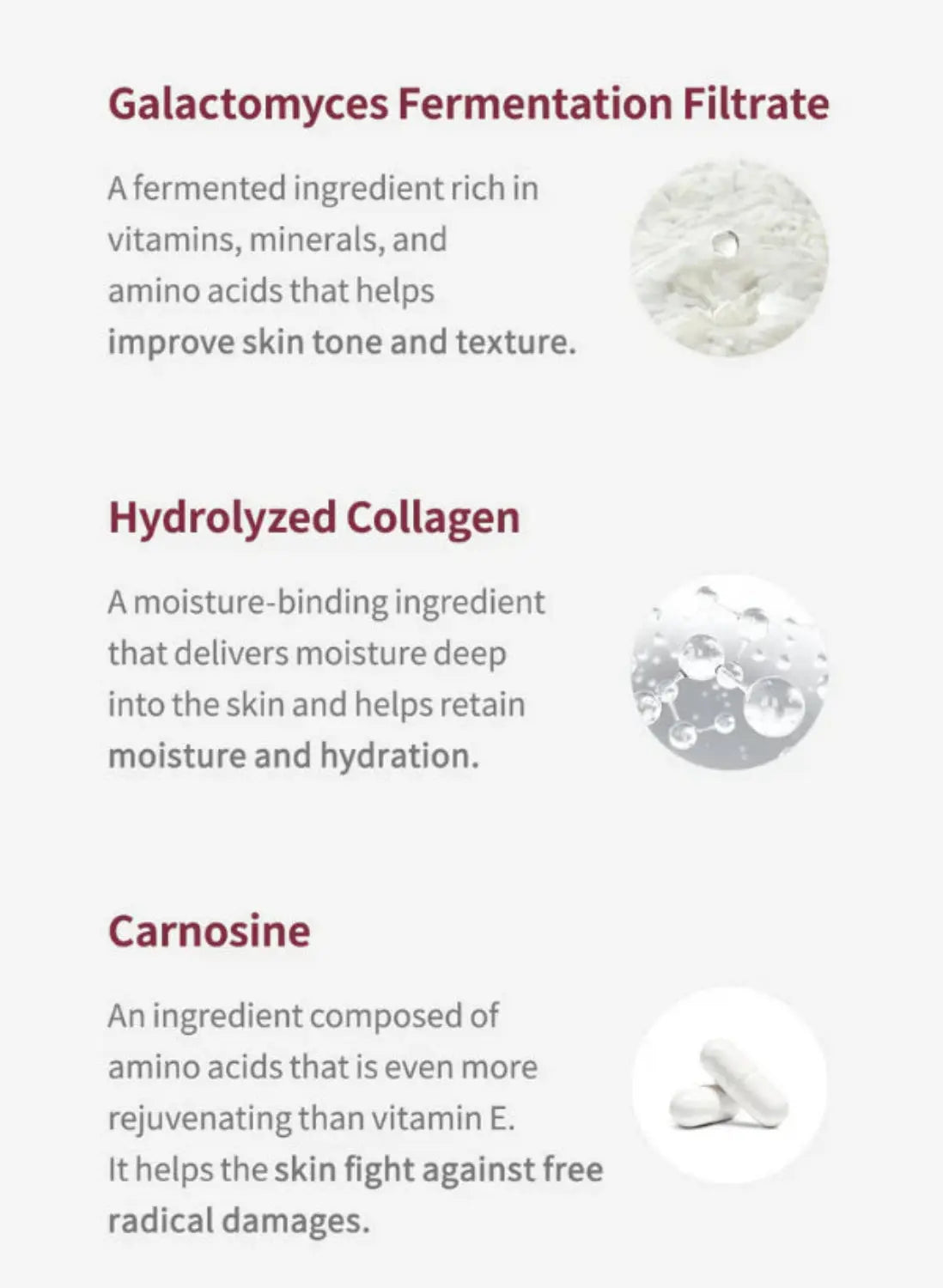 Galactomyces Ferment Filtrate (24.8%), Hydrolyzed Collagen Extract, Squalane, Cetearyl Alcohol, Glycerin, Caprylic/Capric Triglyceride, Propanediol, 1,2-Hexanediol, Niacinamide, Phaseolus Radiatus Seed Water, Hamamelis Virginiana (Witch Hazel) Water, Oryza Sativa (Rice) Bran Water, Rosa Centifolia Flower Water, Polyglyceryl-6 Stearate, Panthenol, Centella Asiatica Extract, Glycyrrhiza Uralensis (Licorice) Root Extract, Saccharomyces Ferment Filtrate, Dioscorea Japonica Root Extract, Salix Alba (Willow) Bark Extract, Simmondsia Chinensis (Jojoba) Seed Oil, Betaine, Centella Asiatica Leaf Extract, Mangifera Indica (Mango) Seed Butter, Polyglyceryl-2 Stearate, Glyceryl Stearate, Stearyl Alcohol, Laminaria Japonica Extract, Cassia Italica Leaf Extract, Rosmarinus Officinalis (Rosemary) Leaf Extract, Chamomilla Recutita (Matricaria) Flower Extract, Camellia Sinensis Leaf Extract, Sh-Oligopeptide-1, Sh-Oligopeptide-2, Sh-Polypeptide-1, Sh-Polypeptide-2, Sodium Hyaluronate, Polygonum Cuspidatum Root Extract, Scutellaria Baicalensis Root Extract, Ethylhexylglycerin, Macadamia Integrifolia Seed Oil, Propanediol Dicaprylate, Beta-Glucan, Hydrogenated Olive Oil Unsaponifiables, Enantia Chlorantha Bark Extract, Oleanolic Acid, Polyglyceryl-6 Behenate, Acanthopanax Senticosus (Eleuthero) Root Extract, Glutathione, Maltodextrin, Hydrolyzed Avocado Protein, Trehalose, Glyceryl Caprylate, Ceramide NP, Carnosine, Viscum Album (Mistletoe) Extract, Rosa Damascena Flower Oil, Rose Flower Oil, Adenosine
